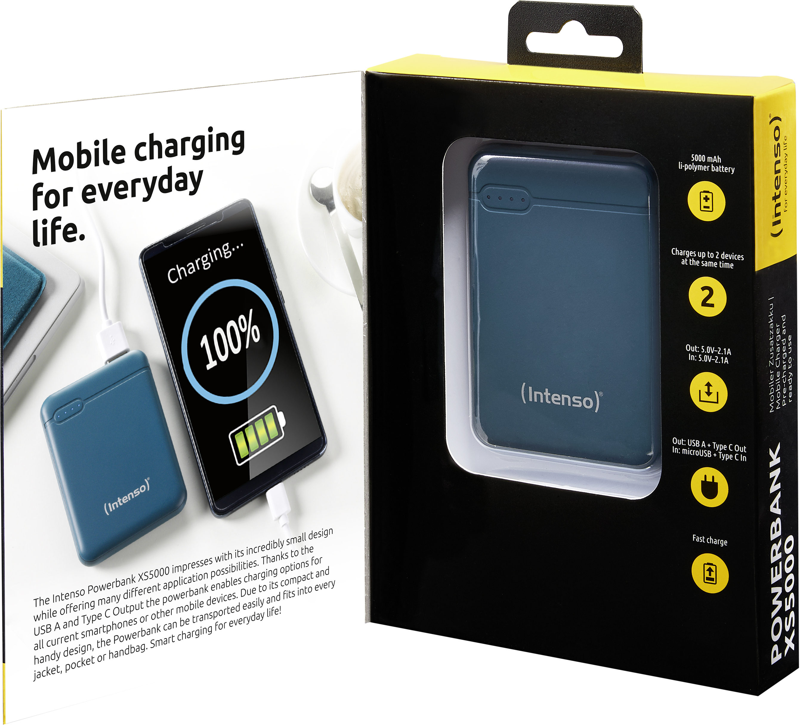 Intenso XS5000. Color del producto: Gasolina, Compatibilidad del cargador: Videocámara digital, Cámara digital, MP3/MP4, Teléfono móvil/smartphone, Tableta, Tipo de visualizador: LED. Tecnología de batería: Polímero de litio, Capacidad de batería: 5000 mAh, Fuente de carga: USB. Voltaje de entrada: 5 V, Corriente de entrada: 2 A, Voltaje de salida: 5 V. Interfaz de entrada: Micro-USB + USB Type-C. Ancho: 90 mm, Profundidad: 63 mm, Altura: 12,6 mm