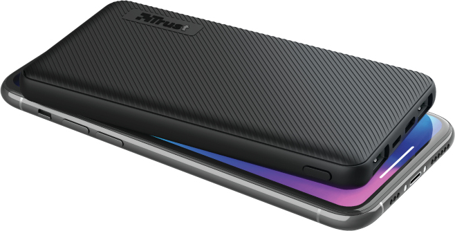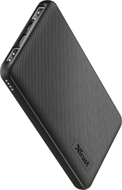 Batería externa ultrafina para cargas rápidas en itinerancia (10 000 mAh)\n\nPotencia rápida sobre la marcha\n\nLos días de las baterías de teléfono agotadas han llegado a su fin. De carga rápida, la batería externa Trust Primo de 10 000 mAh es la mejor fuente de electricidad cuando uno se está desplazando. Compacta y totalmente compatible con puertos USB-A o USB-C, y la capacidad para cargar tres dispositivos simultáneamente, garantiza la conexión en cualquier lugar y en cualquier momento.\n\nPortátil y con alta capacidad\n\nPequeña en tamaño, pero grande en funcionalidad, la batería externa Primo ofrece una capacidad de 10 000 mAh en un diseño compacto que cabe fácilmente en cualquier bolsa. Con este compañero de viaje la conexión está garantizada siempre que se esté dando una vuelta; carga totalmente el teléfono hasta 4 veces y garantiza hasta 46 horas adicionales de batería de teléfono o 12 horas adicionales en el caso de la tableta.*\n*Depende de la marca y del modelo y del estado de la batería. Meramente indicativo\n\nTres dispositivos a la vez\n\nCon 2 puertos USB-A y 1 puerto USB-C se puede cargar prácticamente cualquier tipo de dispositivo de cualquier marca, incluidas Apple y Samsung. También se pueden cargar tres dispositivos simultáneamente; por ejemplo, el teléfono, la tableta y la cámara al mismo tiempo.\n\nCarga y recarga a toda velocidad\n\nLa batería externa Trust Primo de 10 000 mAh es rápida e inteligente: ofrece automáticamente la potencia máxima para los dispositivos**. Además, la batería externa se puede recargar rápidamente con el cable micro-USB incluido o a través del puerto USB-C. El indicador de nivel LED inteligente de la batería externa permite saber cuándo es el momento de recargar.\n**Carga rápida a máxima velocidad mediante USB-C (15 W) o USB-A (12W). La velocidad de carga varía de un dispositivo a otro