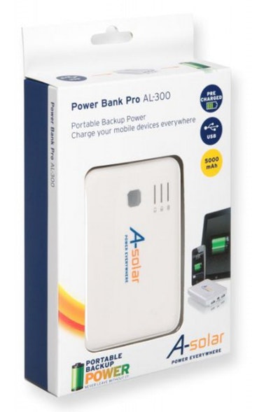 Xtorm AL300. Color del producto: Blanco, Compatibilidad del cargador: Teléfono móvil/smartphone, Tableta, MP3/MP4, GPS, Lector de libros electrónicos. Capacidad de batería: 5000 mAh, Voltaje de la pila: 5 V, Voltaje de entrada: 5 V. Tipos de puertos USB de entrada: Mini-USB. Dimensiones (Ancho x Profundidad x Altura): 110 x 70 x 16 mm, Peso: 145 g