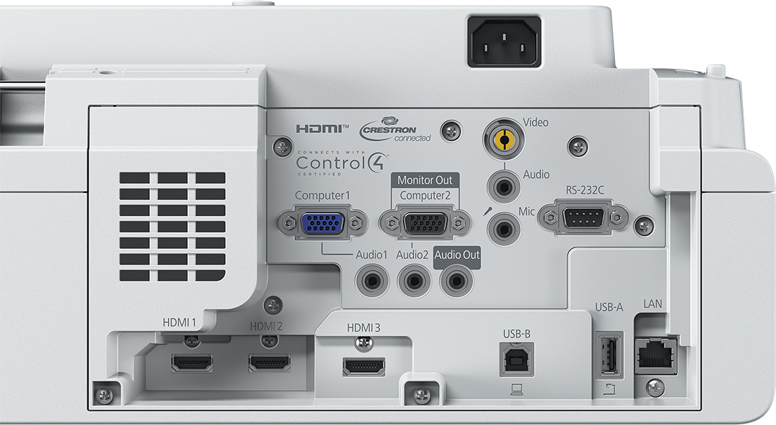 . Brillo de proyector: 3800 lúmenes ANSI, Tecnología de proyección: 3LCD, Resolución original del proyector: XGA (1024x768). Tipo de fuente luminosa: Laser, Duración de la fuente luminosa: 20000 h, Vida útil de la fuente luminosa (modo económico): 30000 h. Enfoque: Manual, Intervalo de longitud focal: 3.7 mm, Distancia focal fija: 3,7 mm. Procesamiento de vídeo: 10 bit, Modos de color de vídeo: Pizarra, Cine, Dinámico, Presentación, sRGB. Tipo de serie de interfaz: RS-232C, Tipo de conector HDMI: De tamaño completo