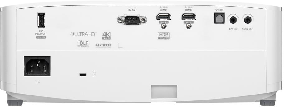 Optoma 4K400X. Brillo de proyector: 4000 lúmenes ANSI, Tecnología de proyección: DLP, Resolución original del proyector: 2160p (3840x2160). Tipo de fuente luminosa: Lámpara, Duración de la fuente luminosa: 10000 h, Potencia de la lámpara: 240 W. Intervalo de longitud focal: 15.84 - 17.42 mm, Tipo de zoom: Manual, Alcance de zoom: 1.1:1. Formatos gráficos soportados: 3840 x 2160, Formato de vídeo soportado: 2160p. Tipo de serie de interfaz: RS-232