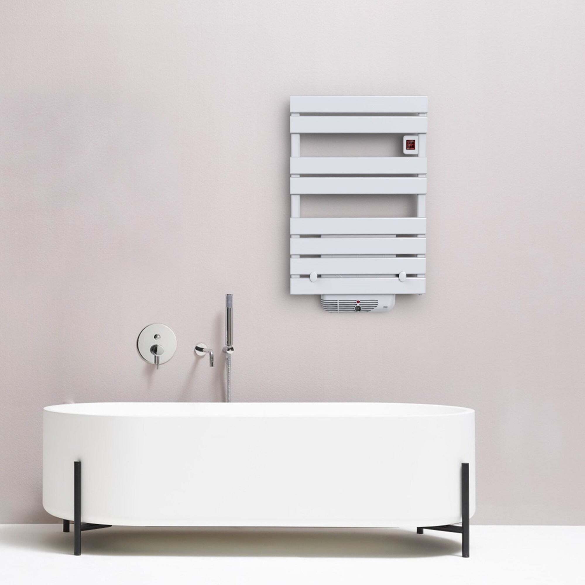 Calentador de inercia de aluminio, Control electrónico con pantalla digital LCD, 4 modos (confort, normal, eco y protección contra las heladas), 9 programas preinstalados, Programación diaria y semanal, Detección de ventana abierta, Protección contra el sobrecalentamiento, Cable piloto de 6 órdenes, Pala plana, Posición vertical, Nueva Directiva ERP(2015/1188), Clase II, IP24 Norma CE/NF/RoHS/ERP. 2 años de garantía.CARACTERÍSTICAS: Calentador de toallas eléctrico con tubo plano de inercia seco. Volumen calentado: 15 m² Programación LCD. Nuevo diseño moderno, sobrio y elegante. Color blanco. Calor suave. Dimensión: 56x12,5xH88cm. Doble sistema de calefacción; Doble tecnología: Inercia + soplador. Su soplador garantiza una mayor comodidad y un secado rápido de la ropa. Función de soplado..PRINCIPIO DE FUNCIONAMIENTO: se compone de tubos de aluminio calentados por una resistencia que libera calor durante varias horas. Los tubos recogen y acumulan el calor producido por las resistencias eléctricas integradas en el material y lo liberan lentamente. Su termostato programable integrado le permitirá ahorrar energía. Calentamiento fácil y uniforme de su toalla y ropa de cama..VENTAJAS: Aumento rápido de la temperatura, calor uniforme, mejor relación calidad-precio, consume menos energía que los calefactores radiantes o los paneles radiantes y sigue irradiando calor cuando se apaga. Más cómodo que un calefactor de convección, se ajusta suavemente a la temperatura deseada. La sensación de calor es suave y continua..INSTALACIÓN Y MANTENIMIENTO: Fácil instalación en un baño. Termostato programable. Calor envolvente y constante. Pantalla digital a la altura del hombro: fácil de usar. No requiere mantenimiento. Dispositivo de seguridad térmica con rearme automático. Montaje en la pared con cerradura. Kit de fijación incluido. 2 años de garantía. Vendido por una empresa francesa con sede en Francia. Normativa CE y NF.