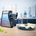 Rallador eléctrico multifunción - 4 conos intercambiables: rallar fino y grueso, rebanar, picar - 1 empujador - Ancho del canal: 4,5 cm - 1 botón de funcionamiento - Carcasa de acero inoxidable - Accesorios aptos para lavavajillas: canal, conos