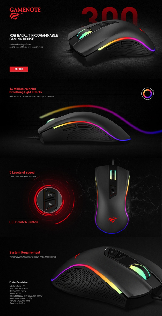 Ratón Gaming Havit MS300 está diseñado para todos los tipos de jugadores, tanto para el juego como para cualquier uso diario. Gracias a los 5 niveles de DPI programable puedes ajustar a la sensibilidad que más te guste. Cuenta con chip de juego profesional AVAGO A3050. Software de configuración dedicado, capaz de soportar la programación de teclas Macro. Función de avance / retroceso. .Características:.Cinco conmutadores de resoluciones DPI (1000-1500-2000-3000-4000DPI). .16 millones de efectos de luces de colores. El color puede personalizarse. .Plug&Play. No tiene que preocuparse por la instalación de programas, ya que con la función de plug&play sólo tienes que conectar por el puerto USB y jugar. .Sistemas compatibles: Windows 2000 / XP / Vista / Windows 7 / Windows 8 / Windows 10 / linux / Mac .Especificaciones Havit MS300:.Modelo: MS300 .Tipo de interfaz: USB .Tamaño: 125.5 * 69 * 40.5mm .Número teclas: 7 .Sensor: A3050 .Resolución: 1000-1500-2000-3000-4000DPI .Aceleración máxima: 20g .Vida de teclas: 10,000,000 de pulsaciones .Longitud del cable: 1.8m
