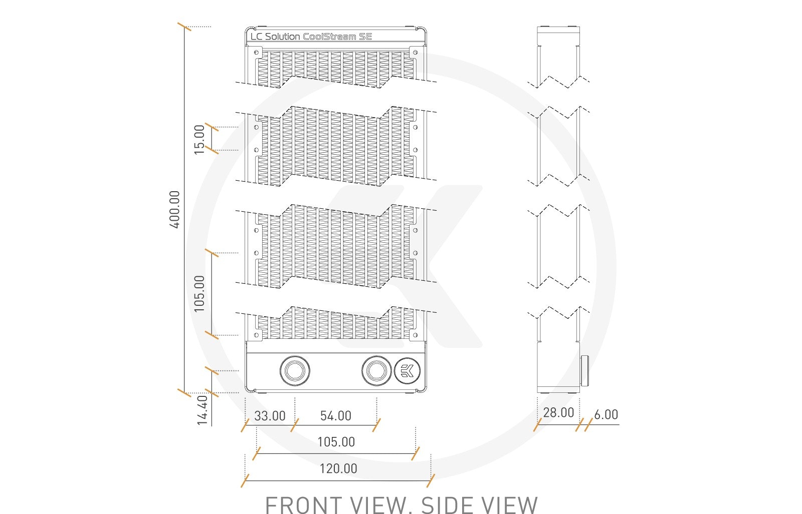 EK Water Blocks EK-CoolStream SE 360. Utilizar con: Tarjeta de video, Capacidad de refrigerante: 0,155 L, Certificación: RoHS. Tipo: Interno, Material: Aluminio, Latón, Cobre, Color del producto: Negro. Ancho: 120 mm, Profundidad: 120 mm, Altura: 28 mm