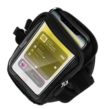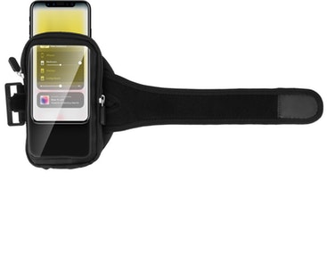 Brazalete deportivo para Smartphone de máx. 168 x 89 mm. Con membrana táctil. Cierre con correa adhesiva ajustable. Con aberturas para auriculares y cable cargador. Con bolsillo para las llaves.
