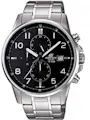 Reloj con movimiento de cuarzo de acero sobre brazalete de acero color plata. Esfera negra con pantalla analógica, ventana de fecha a las 3, segundero pequeño y alarma. Reloj resistente a una presión de 10 ATM.