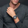 Reloj de acero con correa plateada. Esfera negra con pantalla analógica, cronógrafo y taquímetro. Movimiento de cuarzo. Reloj resistente a una presión de 10 ATM.