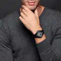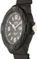 Reloj de acero y resina con correa de resina negra. Esfera negra con pantalla analógica, ventana de fecha a las 3, calendario de día y fecha y formato a las 12. Movimiento de cuarzo.Reloj resistente a una presión de 10 ATM.