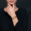 Reloj de resina sobre brazalete de acero dorado. Esfera dorada con pantalla digital, calendario diurno y formato de 12/24 horas, movimiento de cuarzo. Reloj resistente a una presión de 3 ATM.