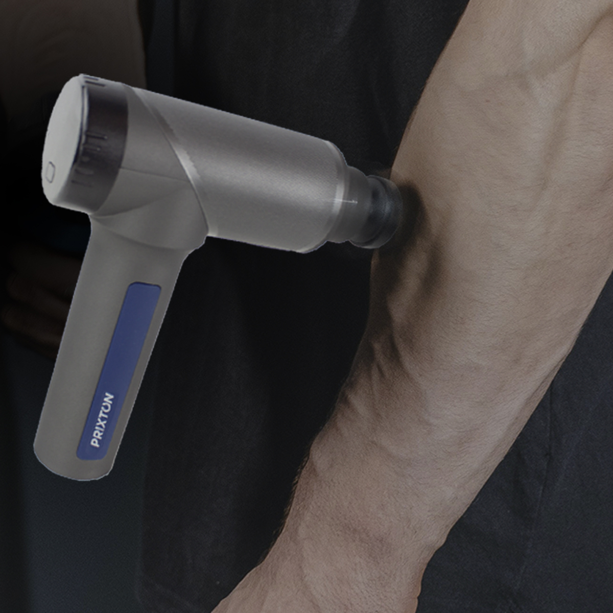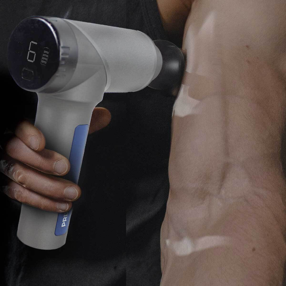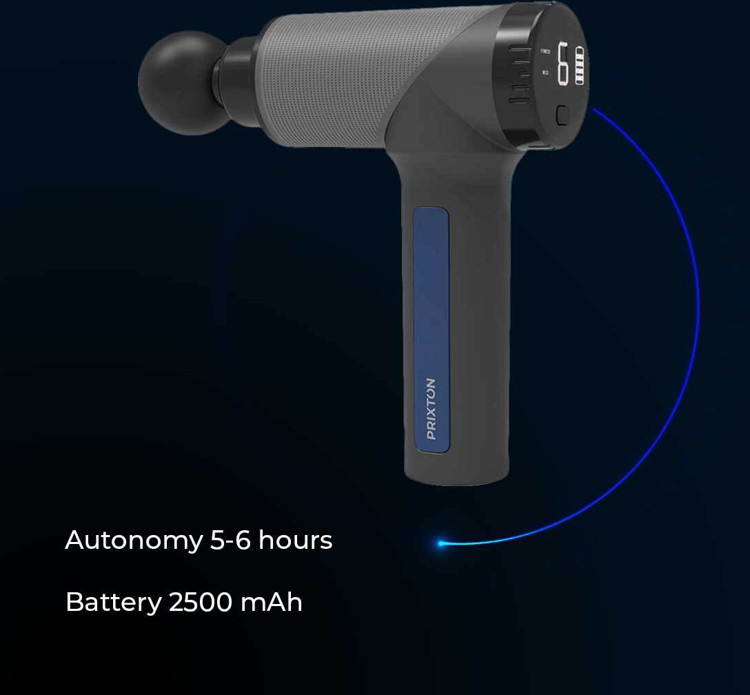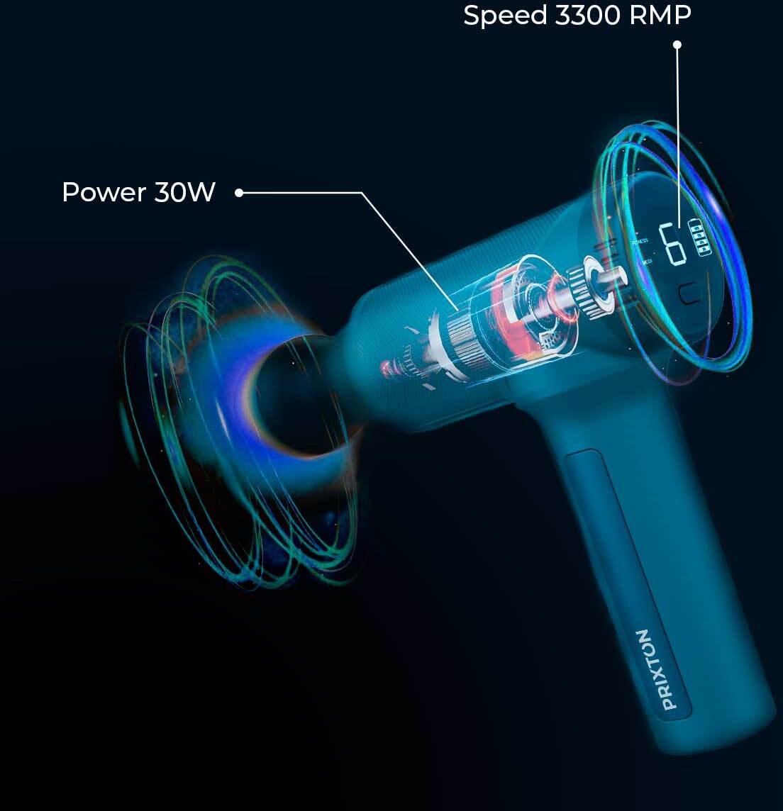 Prixton PRIXTON Massage Gun Fit Pistola de Masaje Muscular Potencia 30 W - 3300 rpm 9 Velocidades 6 Cabezales Modo Fitness y Terapia Física Diseño Inalámbrico y Ligero Funda y Maletín Incluido