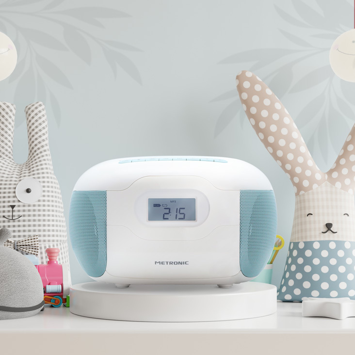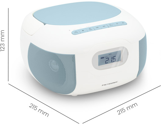 La colección PASTEL by METRONIC, con sus colores suaves y de tendencia, atraerá a grandes y pequeños. Su suave diseño decorativo aportará un toque contemporáneo al interior de tu hogar en cualquier época del año. Este reproductor de CD tiene todo lo que necesitas con sus múltiples funciones: aprovecha la conectividad Bluetooth, un puerto USB, un lector de tarjetas micro SD, radio y una entrada jack de audio de 3,5 mm. También dispones de un botón de ""Programación"" para crear tus listas de reproducción y almacenar tus emisoras de radio favoritas. Gracias a su mango ergonómico y su funcionamiento con pilas (no incluidas), podrás disfrutar de tu música en cualquier lugar.Sonido: 6W (2 x 3W).Compatible con cualquier dispositivo equipado con tecnología Bluetooth.Puerto USB MP3 + Entrada de audio de 3,5 mm + Salida de auriculares + Radio FM.Reproduce CD, CD-R, CD-RW, CD-MP3.Funciones: repetición y programación de tus playlists.Alimentado por red o pilas (6 x LR14 no incluidas).Dimensiones: L 215x W 215 x H 123 mm.