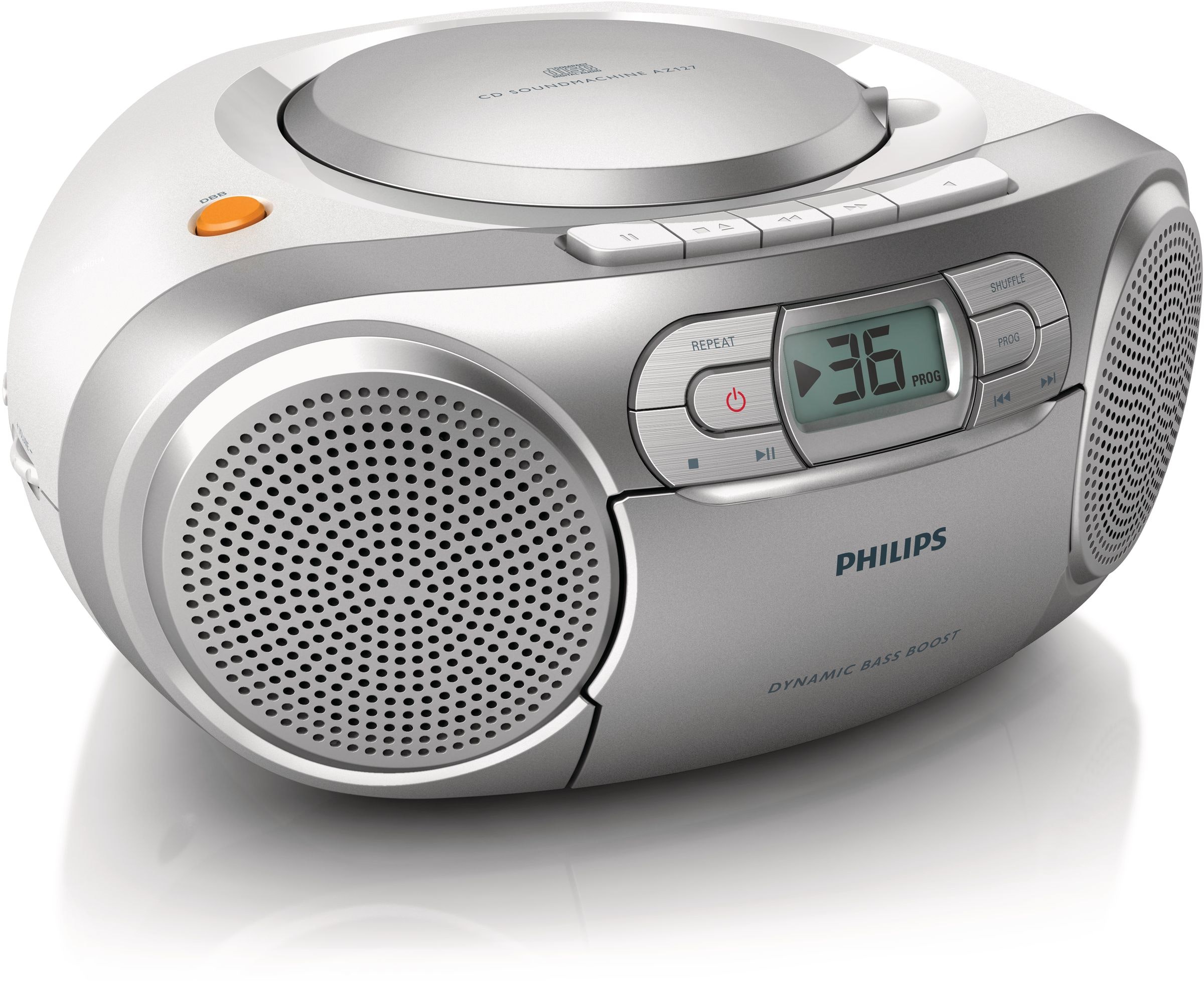 . Sistema de audio: stereo, Tecnología de mejora de sonido: Dynamic Bass Boost. Potencia estimada RMS: 2 W. Bandas de radio soportadas: FM. Tipo de dispositivo: Reproductor de CD portátil, Color del producto: Gris, Tecnología del reproductor de cassette: Mecánico. Pantalla: LCD