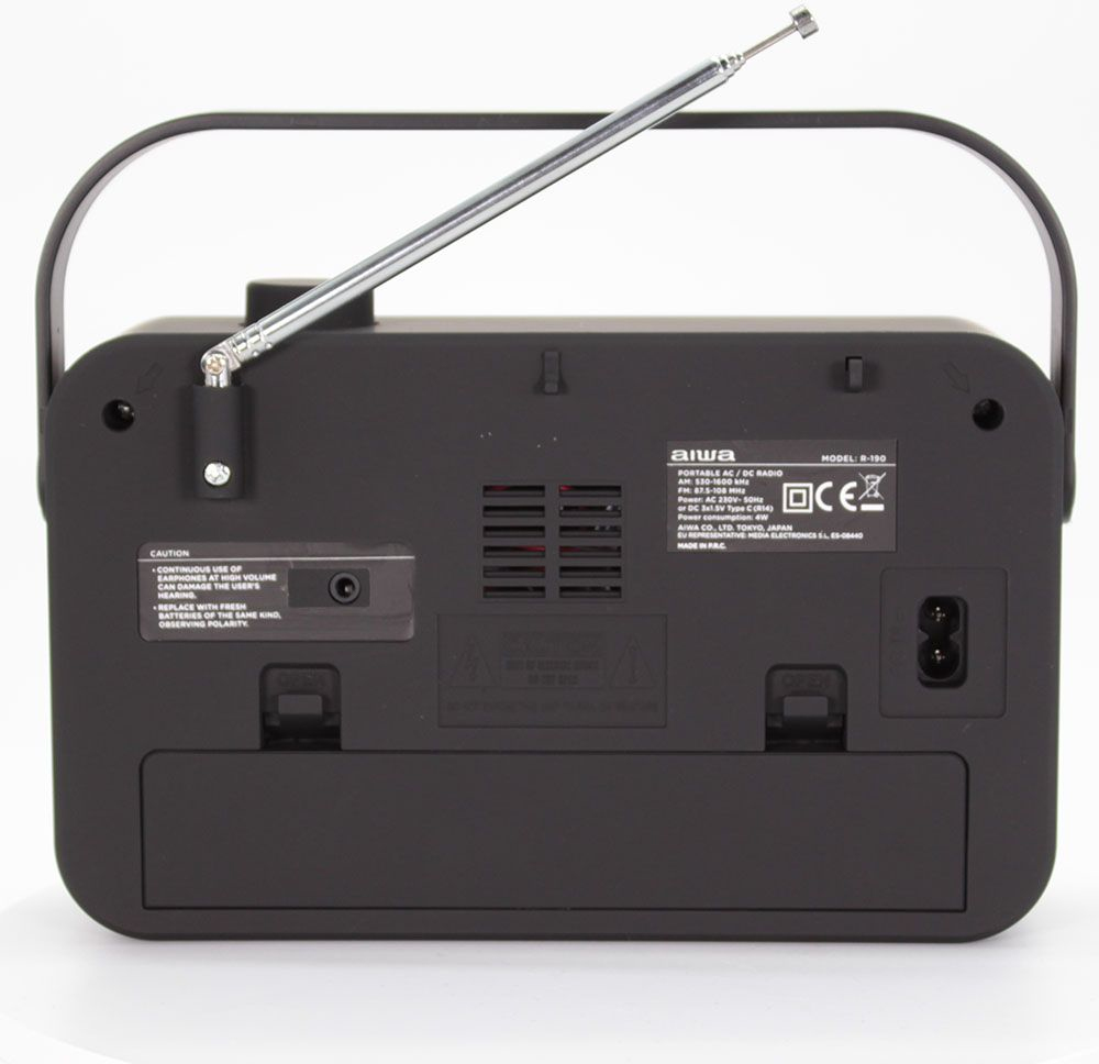 Aiwa R-190RD. Tipo de radio: Portátil, Tipo de sintonizador: Analógica, Bandas de radio soportadas: AM,FM. Potencia estimada RMS: 2 W, Rango de frecuencia: 80 - 20000 Hz. Unidad de disco: 10 cm, Obstrucción: 8 O. Color del producto: Negro, Rojo, Control de volumen: Giratorio, Tipo de antena: Externo. Tamaño de baterías compatibles: C, Voltaje de la pila: 1,5 V