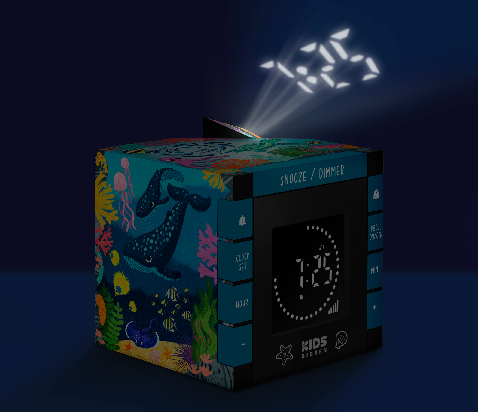 Bigben Interactive R70 – Ocean. Tipo de radio: Reloj, Tipo de sintonizador: Analógica, Bandas de radio soportadas: FM. Tipo de visualizador: LCD, Color de luz de fondo: Blanco, Dígitos de la pantalla: 4 dígitos. Color del producto: Multicolor, Material: De plástico, Función de proyección: Tiempo. Tecnología de batería: Alcalino, Tamaño de baterías compatibles: AAA, Tipo de batería: LR03. Alimentación: Corriente alterna, Batería, Voltaje de entrada AC: 230 V