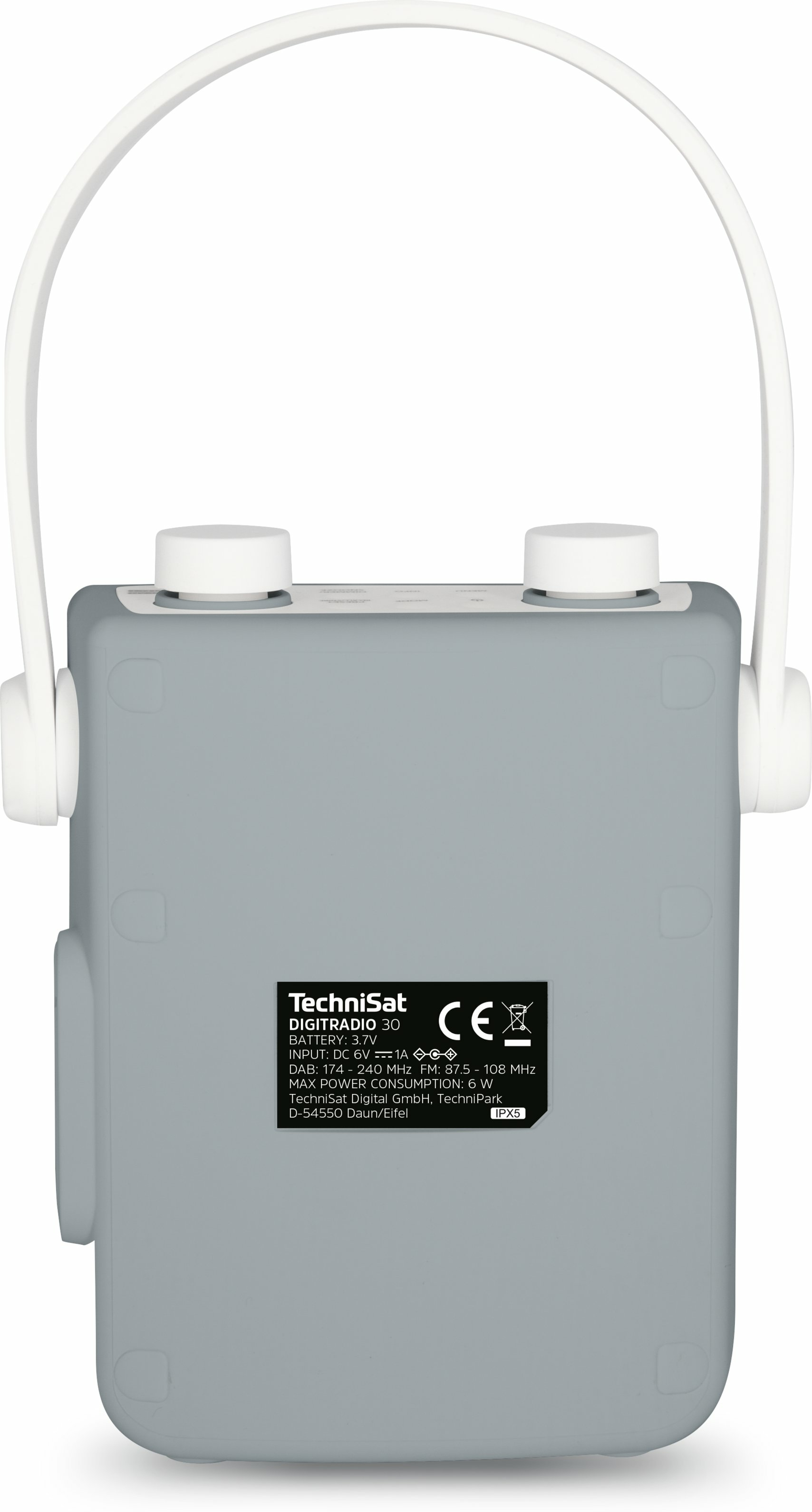 TechniSat Digitradio 30. Tipo de radio: Portátil, Tipo de sintonizador: Digital, Bandas de radio soportadas: DAB+,FM. Potencia estimada RMS: 2 W. Auriculares: 3,5mm / Bluetooth. Color del producto: Gris, Control de volumen: Giratorio, Idiomas OSD: Alemán, Inglés, Francés, Italiano. Tecnología de batería: Ión de litio, Capacidad de batería: 3000 mAh, Tipo de batería: Batería integrada