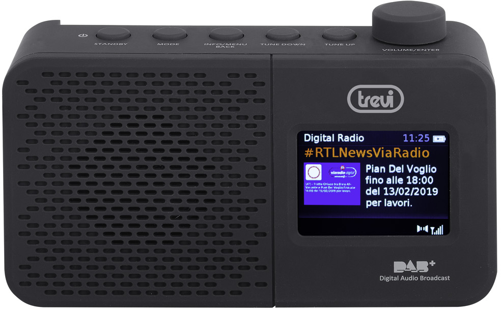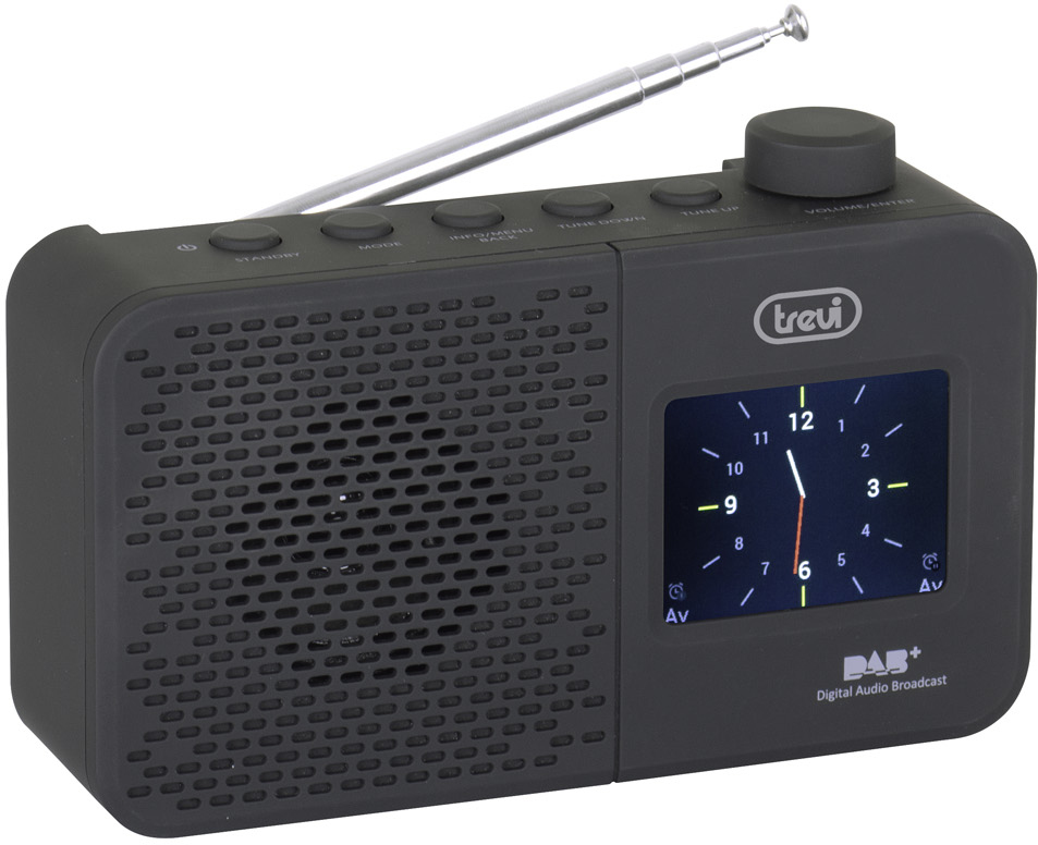 Trevi 0DA79500. Tipo de radio: Portátil, Tipo de sintonizador: Analógico y digital, Bandas de radio soportadas: DAB,DAB+,FM. Tipo de altavoces: De 1 vía. Tipo de visualizador: LCD, Diagonal de la pantalla: 6,1 cm (2.4""). Auriculares: 3,5 mm. Color del producto: Negro, Coloración: Monótono, Control de volumen: Botones