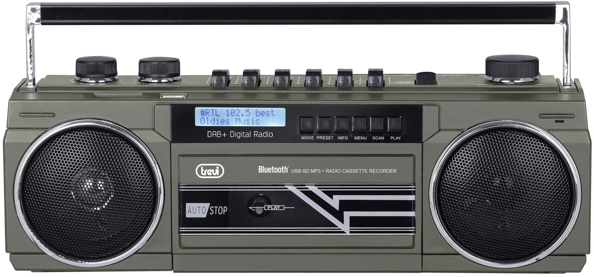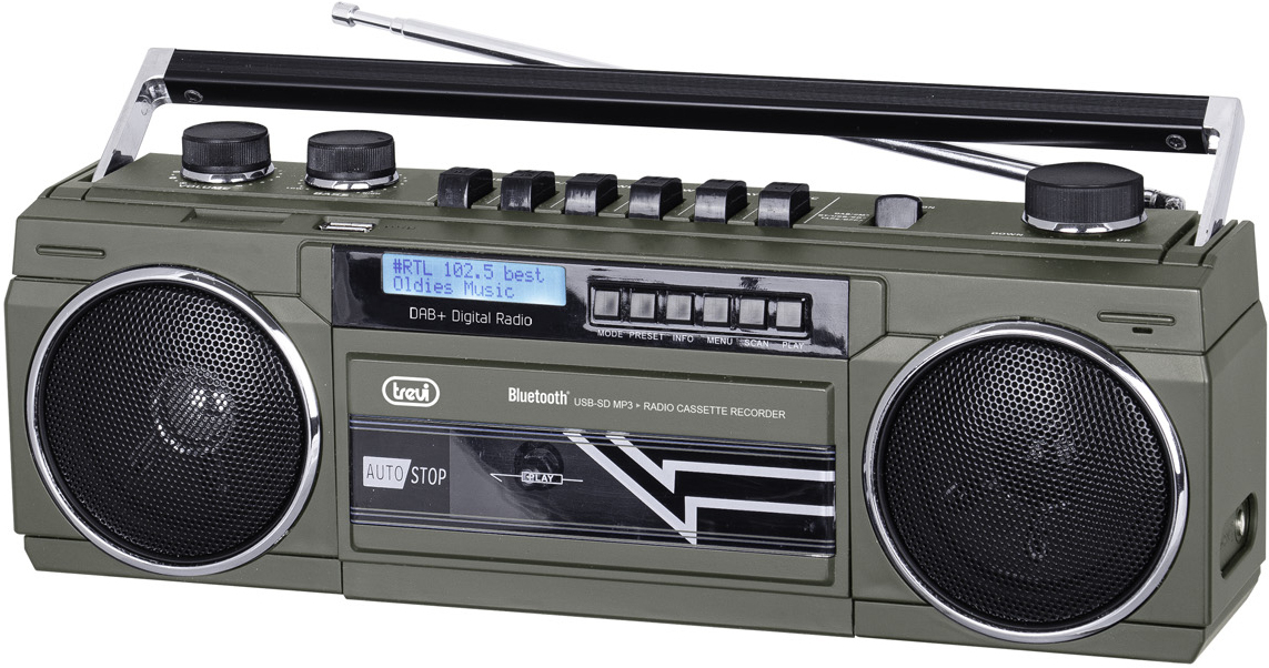 Trevi RR 511 DAB. Tipo de radio: Portátil, Tipo de sintonizador: Digital, Bandas de radio soportadas: DAB,DAB+,FM. Tipo de visualizador: LCD. Tarjetas de memoria compatibles: SD. Alimentación: Corriente alterna, Batería, Voltaje de entrada AC: 230 V, Frecuencia de entrada AC: 50 Hz. Ancho: 317 mm, Profundidad: 89 mm, Altura: 114 mm