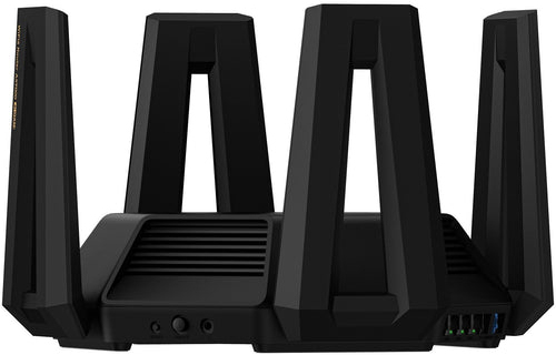 Xiaomi Mi Router AX9000. Banda Wi-Fi: Tribanda (2,4 GHz/5 GHz/5 GHz), Estándar Wi-Fi: Wi-Fi 6 (802.11ax), Tasa de transferencia de datos WLAN (máx.): 4804 Mbit/s. Tipo de interfaz Ethernet LAN: Gigabit Ethernet, Ethernet LAN, velocidad de transferencia de datos: 10,100,1000,2500 Mbit/s, Estándares de red: IEEE 802.3, IEEE 802.3ab, IEEE 802.3u. Algoritmos de seguridad soportados: WPA-PSK, WPA2-PSK, WPA3-SAE. Tipo de producto: Router de sobremesa, Color del producto: Negro, Indicadores LED: Actividad, LAN, Sistema, WLAN. Diseño de la antena: Externo