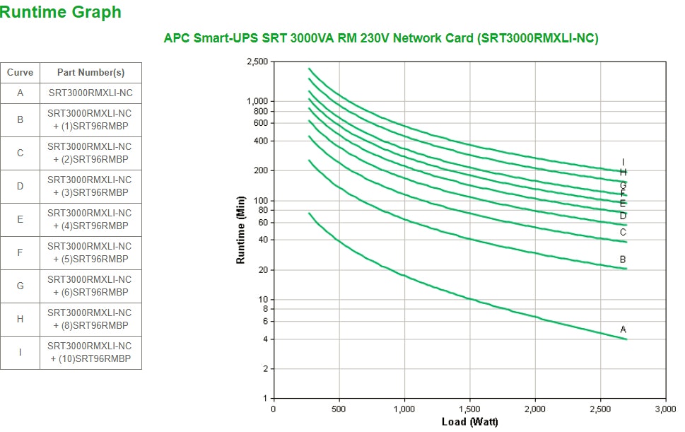 APC Smart-UPS On-Line SRT. Topología UPS: Doble conversión (en línea), Capacidad de potencia de salida (VA): 3000 VA, Potencia de salida: 2700 W. Tipo de salida AC: C13 acoplador, C19 acoplador, Conector: C20 acoplador, Tipo de serie de interfaz: RJ-45. Tecnología de batería: Sealed Lead Acid (VRLA), Capacidad de la batería: 505 VAh, Tiempo típico de respaldo a carga completa: 4 min. Factor de forma: Montaje en rack o Montaje en bastidor, Color del producto: Negro, Capacidad del rack: 2U. Ancho: 432 mm, Profundidad: 635 mm, Altura: 85 mm