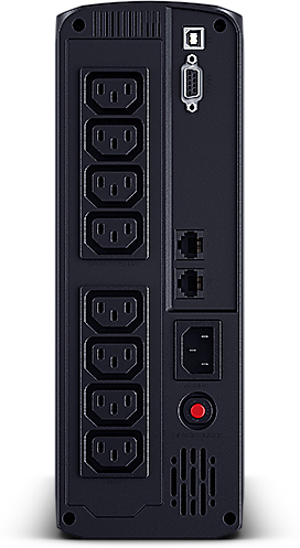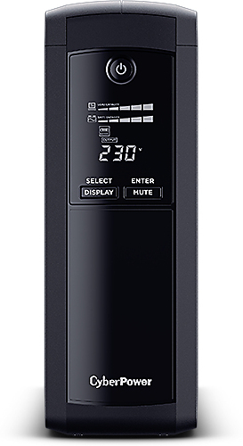 CyberPower VP1600EILCD. Topología UPS: Línea interactiva, Capacidad de potencia de salida (VA): 1,6 kVA, Potencia de salida: 960 W. Tipo de salida AC: C13 acoplador, Conector: C14 acoplador, Cantidad de salidas AC: 8 salidas AC. Tecnología de batería: Sealed Lead Acid (VRLA), Tiempo típico de respaldo a carga completa: 2 min, Tiempo típico de respaldo a media carga: 11 min. Factor de forma: Torre, Color del producto: Negro, Material de la carcasa: Plástico. Ancho: 100 mm, Profundidad: 260 mm, Altura: 227 mm