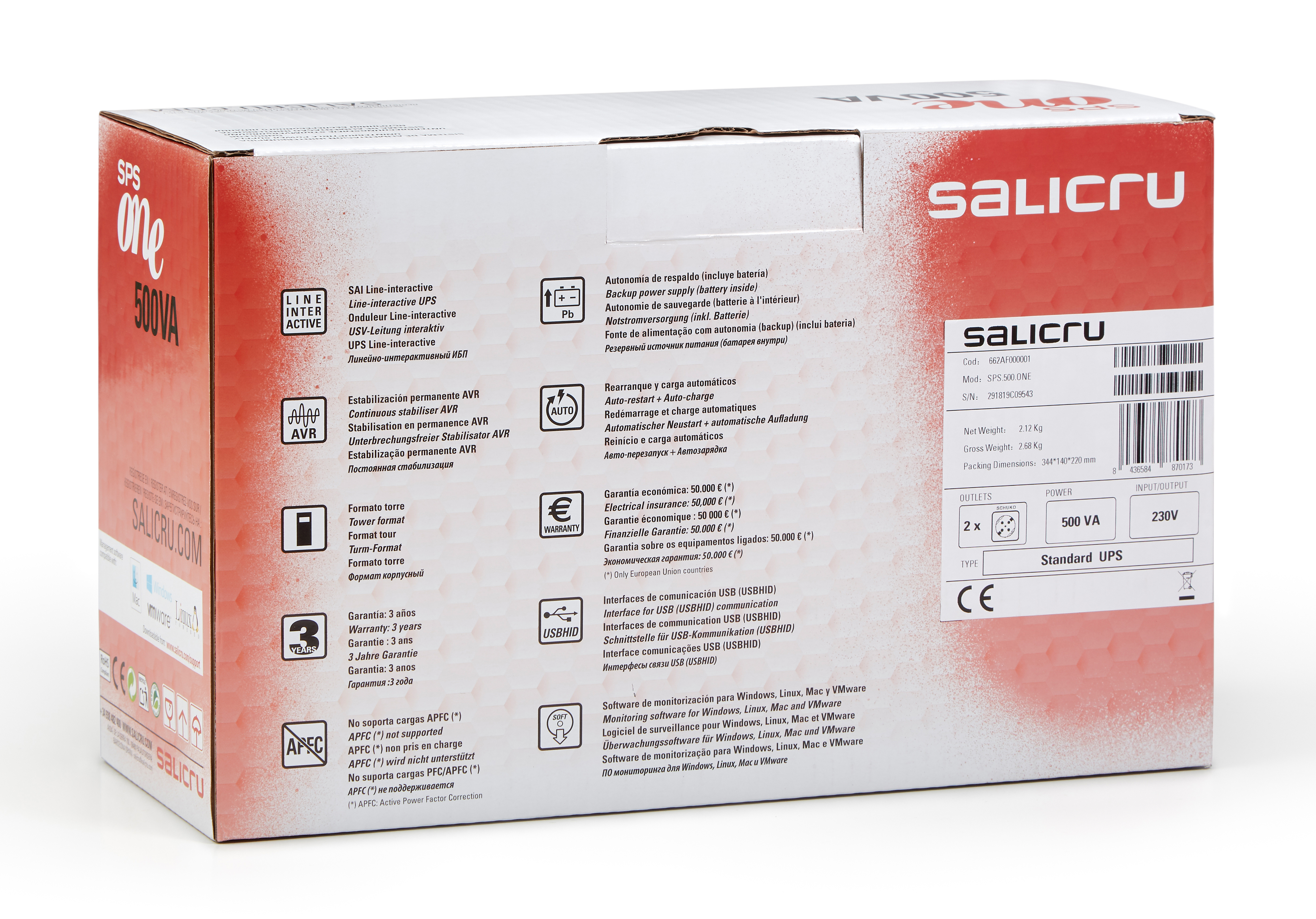 Sistema de Alimentación Ininterrumpida (SAI/UPS) de formato minitorre con topología Line-interactive, la serie SPS ONE de Salicru proporciona back-up de batería (con salida de ondulador pseudosenoidal) y protección contra sobrecargas. Durante los cortes de tensión, los equipos SPS ONE entregan respaldo de batería para realizar un apagado correcto del sistema informático y proteger contra la pérdida de datos y daños a la electrónica. Funcionamiento mediante regulación automática de tensión (AVR) para corregir pequeñas fluctuaciones de tensión sin tener que utilizar la batería, alargando la vida útil de ésta. La función AVR es esencial en áreas donde las fluctuaciones de tensión ocurren con frencuencia. Incorpora interface de comunicación SAI/PC del tipo USB con protocolo HID, lo que le permite la configuración de parámetros, control del SAI y cierre o hibernación del ordenador a través del puerto USB. Compatible con sistemas operativos Windows, Linux y Mac. También disponible software de gestión y monitorización del SAI para cierre de ficheros/aplicaciones para familia Windows, Linux y Mac; gratuito y descargable desde www.salicru.com. La serie SPS ONE está disponible en las potencias de 500, 700, 900, 1100, 1500 VA y 2000 VA.