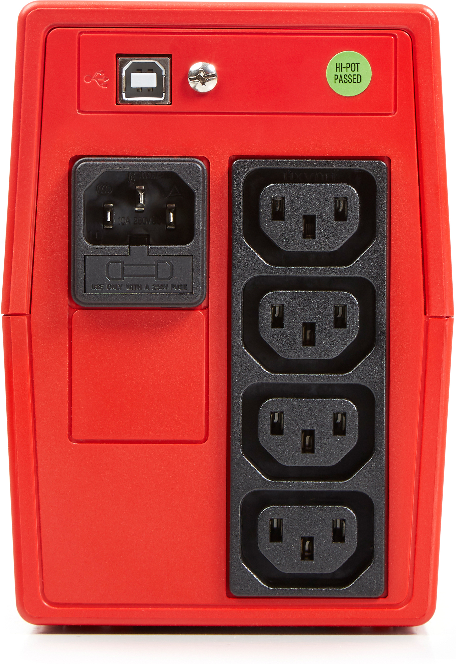 . Topología UPS: Línea interactiva, Capacidad de potencia de salida (VA): 900 VA, Potencia de salida: 480 W. Tipo de salida AC: C13 acoplador, Cantidad de salidas AC: 4 salidas AC, Tipo de puerto USB: USB Tipo B. Tecnología de batería: Plomo-Calcio (Pb-Ca), Tiempo típico de respaldo a carga completa: 20 min, Vida útil de la batería (máx.): 5 año(s). Factor de forma: Torre, Color del producto: Rojo, Blanco, Seguridad: EN-IEC 62040-1-1; EN-IEC 60950-11. Ancho: 101 mm, Profundidad: 300 mm, Altura: 142 mm