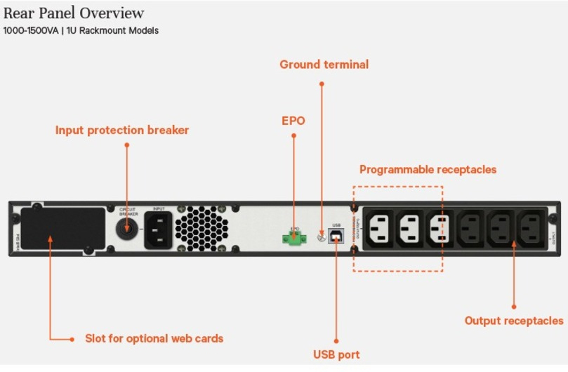 . Topología UPS: Línea interactiva, Capacidad de potencia de salida (VA): 1 kVA, Potencia de salida: 900 W. Tipo de salida AC: C14 acoplador. Tecnología de batería: Sealed Lead Acid (VRLA), Capacidad de la batería: 9 Ah, Voltaje de la pila: 6 V. Factor de forma: Montaje en rack o Montaje en bastidor, Color del producto: Negro, Capacidad del rack: 1U. Ancho: 4380 mm, Profundidad: 4800 mm, Altura: 440 mm
