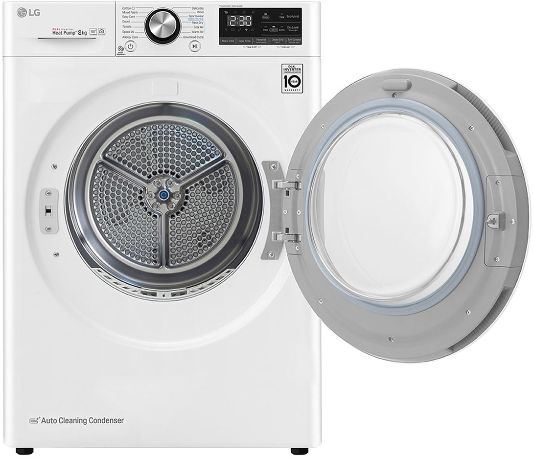 LG RC80V9AV2W. Tipo de instalación: Independiente, Tipo de carga: Carga frontal, Sistema de secado: Bomba de calor. Capacidad de carga: 8 kg, Clase de secado: A, Tiempo de ciclo: 211 min. Clase de eficiencia de energía: A+++, Consumo de energía: 1,32 kWh, Consumo de energía anual: 159 kWh. Ancho: 600 mm, Profundidad: 690 mm, Altura: 850 mm