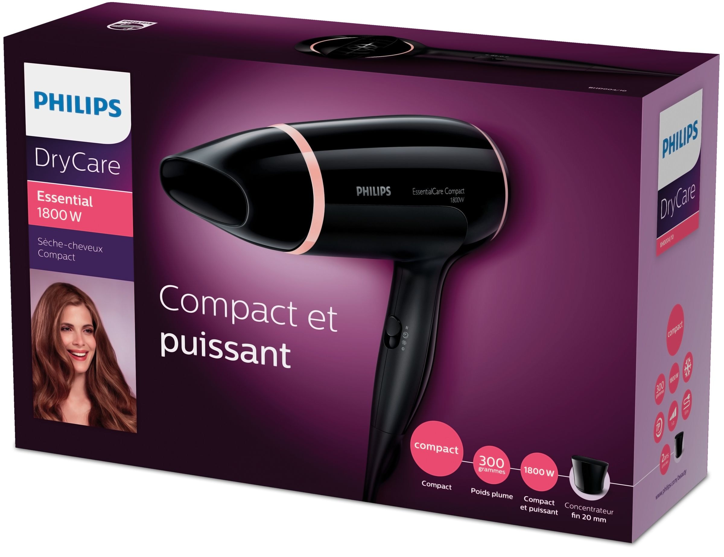 Philips BHD004/10, Essential Care. Tipo de Motor: CC. Tipo de colgador: Con agujero en la empuñadura para colgar, Longitud del cable: 1,8 m. Potencia: 1800 W, Voltaje de entrada AC: 220-240 V, Frecuencia de entrada AC: 50 - 60 Hz. Ancho: 274 mm, Profundidad: 88 mm, Altura: 179 mm. Peso del paquete: 125 g, Dimensiones del embalaje (alto x alto x peso): 594 x 343 x 206 mm