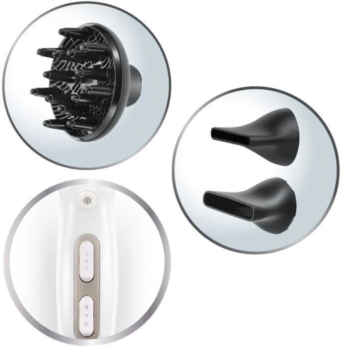 Motor AC - Potencia 2300W - Flujo de aire 130km/h - Retiene la humedad - Preserva la hidratación del cabello - Seca a baja temperatura para un cabello saludable - Iónico - Grill cerámico - 3 temperaturas - 2 velocidades - Aire frío - 1 Concentrador fino - Concentrador amplio - Difusor - Desmontable parrilla trasera