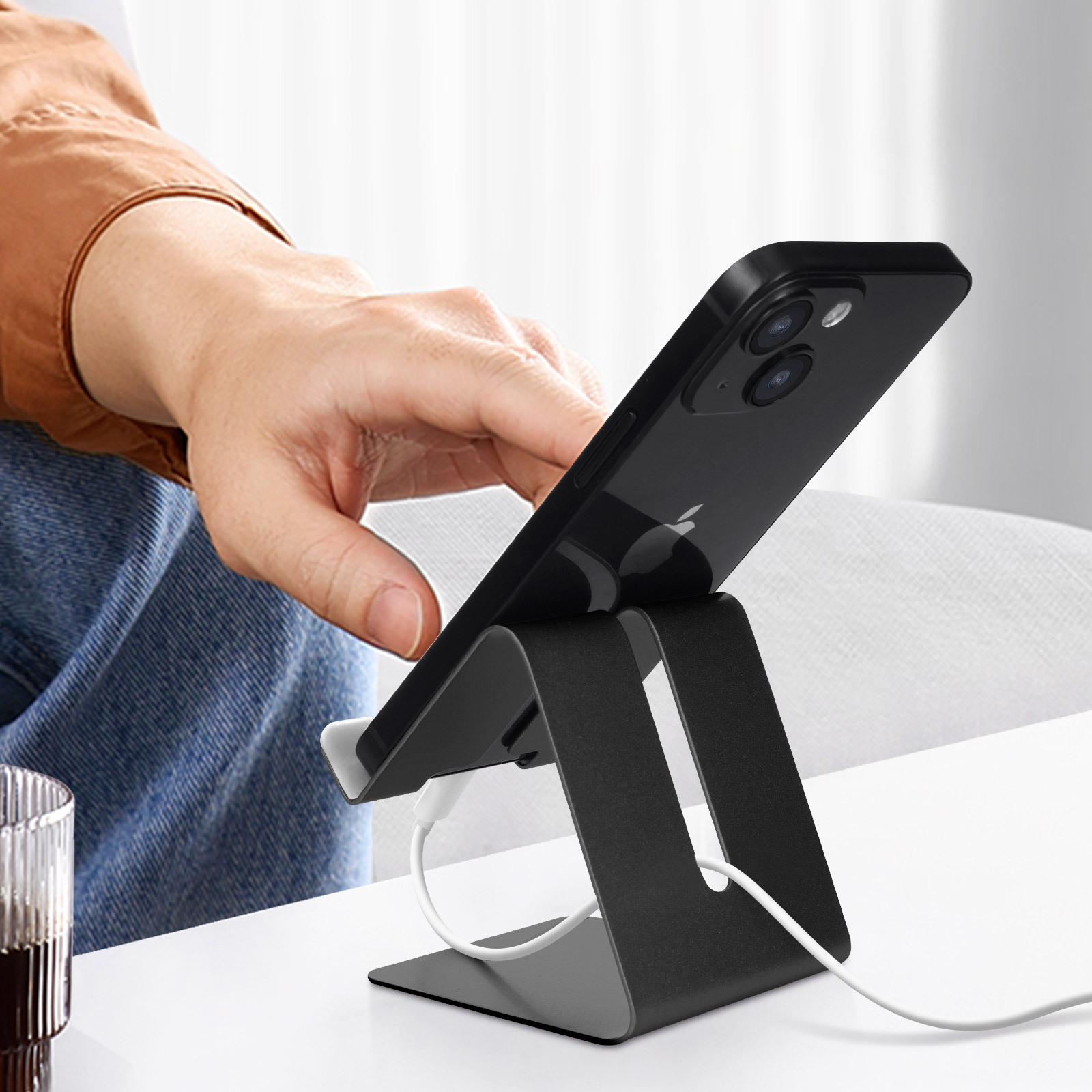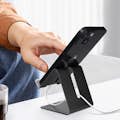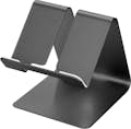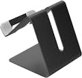 Soporte de escritorio metálico para smartphone de hasta 6 pulgadas, Serie S014. Modo retrato o paisaje para un ángulo de vista óptimo. Almohadillas y bordes antideslizantes para evitar arañazos y caídas. Espacio para cable. Formato compacto.