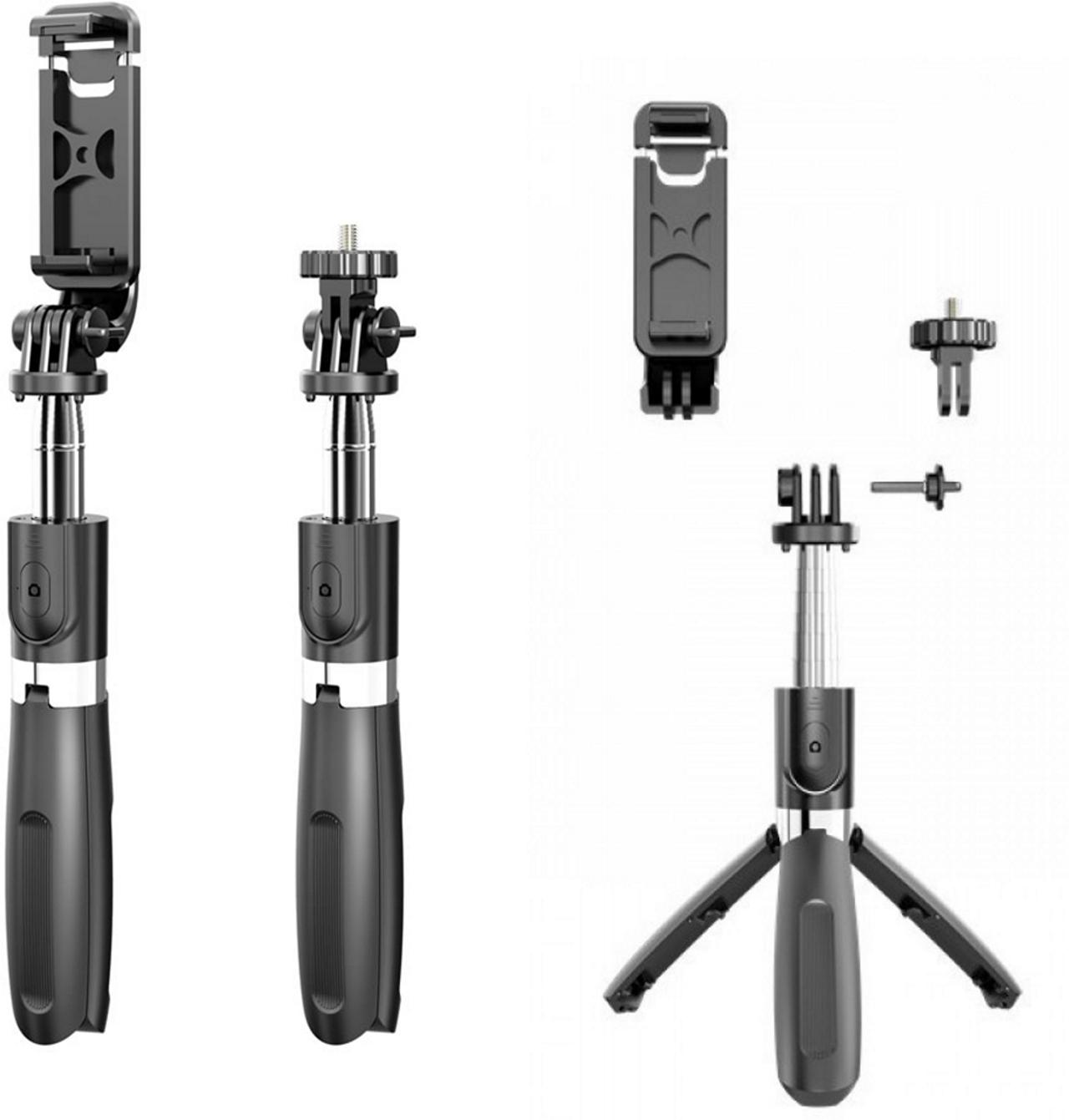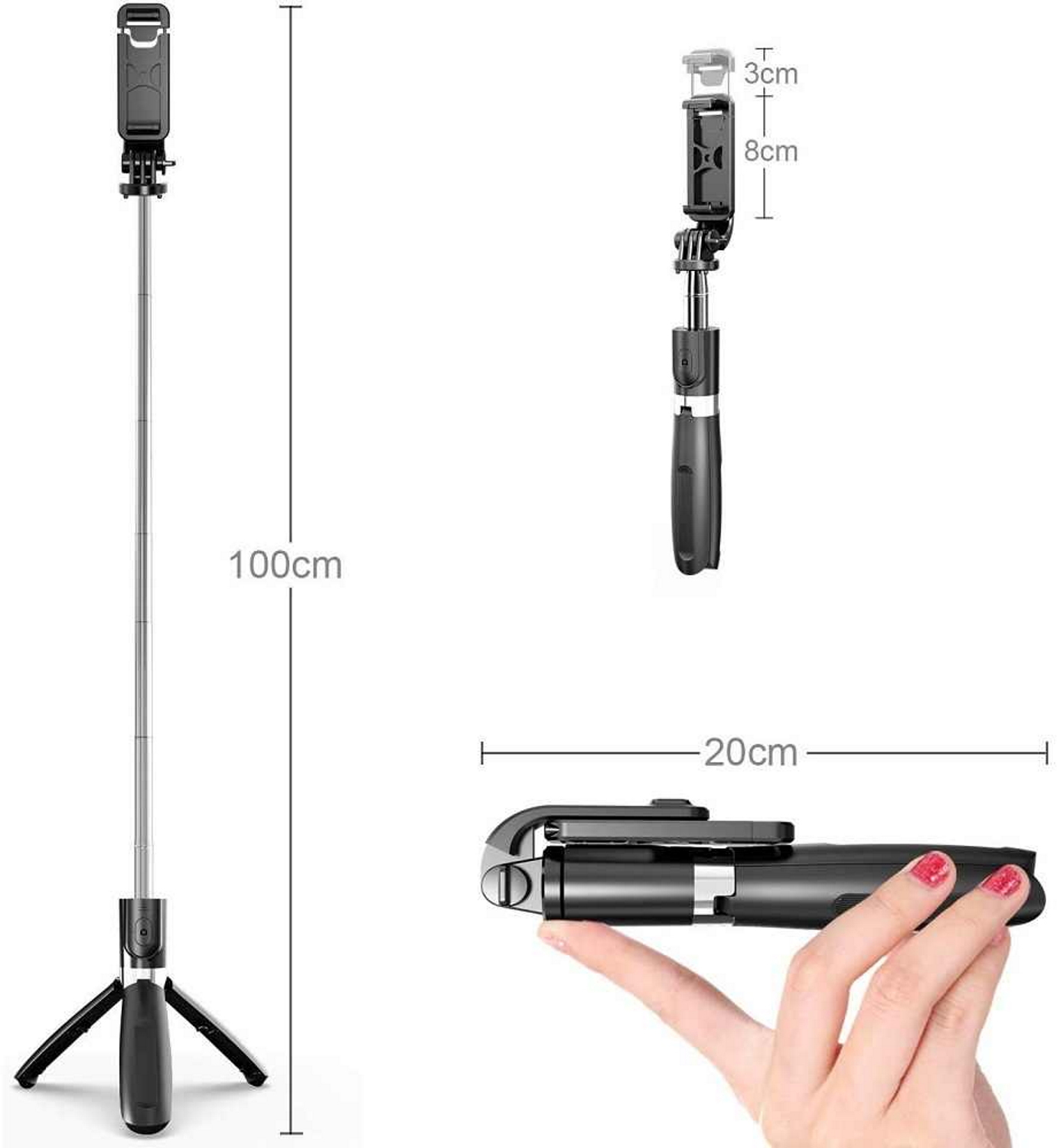 Trípode extensible para Smartphone y Cámaras 3 en 1:\n- Permite su uso como palo selfie y como Tripode de viaje.\n- Incorpora un mando distancia Bluetooth en la empuñadura que se puede extraer para realizar fotos con el tripode a distancia.\n- Su cabezal intercambiable permite el uso con Smartphones y con cámaras de acción como GoPro\n\nSu Stick extensible, permite alargar el bastón hasta 1 metro. Su cabezal para acoplamiento para Smartphone y cámaras, permite un giro completo de 360º y 203º en movimiento del cuello, totalmente plegable. Ideal para selfies, videoconferencias, etc. El complemento ideal para realizar tus fotos para Instagram, facebook, TikTok, etc. Imprescincible en tus viajes y sesiones fotográficas en interiores o exteriores.\n\nSu control remoto Bluetooth: incorpora con batería de larga duración reemplazable. El control remoto se puede separar del trípode para lograr una fotografía remota. Su Bluetooth permite un emparajemiento con tu teléfono de hasta 10 metros. Compatible con las app para realizar fotografías, permitiendo disparo inmediato y programado.\n\nMateriales de alta calidad: gracias a sus varillas compactas de acero inoxidable y materiales antideslizantes de ABS y PC, el palo para selfies no solo es liviano, sino también resistente a la corrosión y antideslizante. Pequeño y compacto, puede guardarlo en su bolsillo o bolso, el pie de aleación de aluminio y las otomanas antideslizantes hacen que el trípode sea más estable para grabar o video conversación con familiares o amigos desde el control remoto.\n\nTotalmente compatible para teléfonos IOS / Android de 4.7 a 6.0 pulgadas, cabe destacar terminales de última generación como iPhone XS, XR, X, 8, 8 Plus, 7, 7 Plus, 6S, 6, Samsung Galaxy modelos S20, 9, S10, S10e, S9, S9 Plus, S8, S8 Plus, S7, S7 Edge, Note 10, Huawei P30, P20, P10, Xiaomi y otras marcas