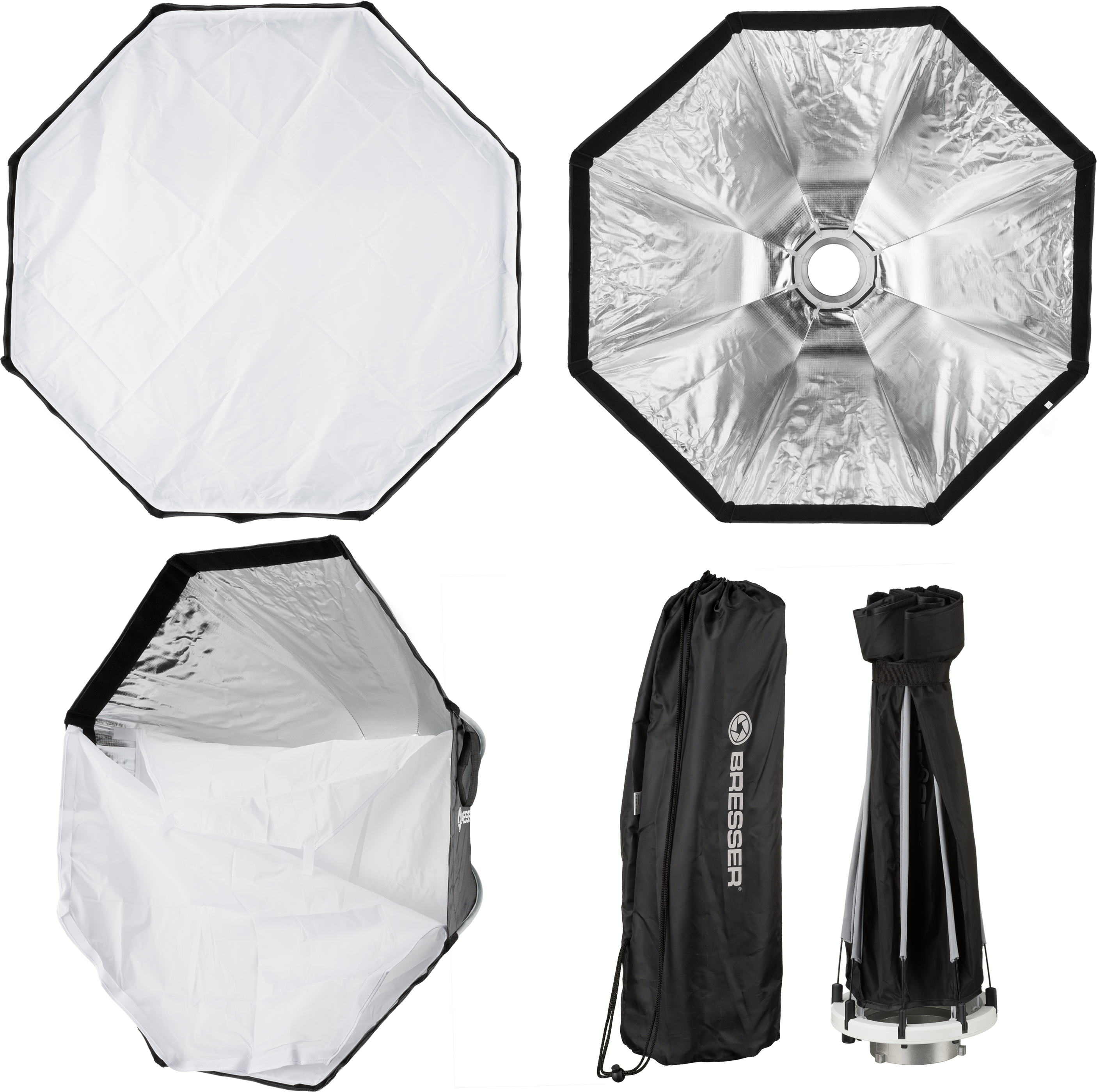 Súper rápido de abrir. Estas son las ventajas de las nuevas Ventanas Súper Rápidas de BRESSER con función de cierre rápido. .Ya no es necesario montar piezas individuales como en el caso de los softboxes clásicos que, una vez abiertos, difícilmente se pueden volver a desmontar. Y a diferencia de las ventanas paraguas anteriores, el nuevo y sencillo sistema de clic requiere menos esfuerzo y también es seguro para los dedos..A cualquiera que necesite una solución rápida, sencilla y transportable por razones de espacio en el estudio o debido a tiroteos regulares en el lugar, le encantarán los softboxes Super Quick de BRESSER. Disponible en diferentes tamaños y con conexiones para diferentes modelos de flash de estudio. .PROPIEDADES.Octabox de 65 cm compatible con todos los flashes acoplables estándar.nuevo sistema clic para un montaje y desmontaje rápido y sin lesiones.mano de obra de alta calidad, puntales metálicos robustos.Cierre de velcro para la fijación de difusores interiores y exteriores.se puede utilizar con mango o en un trípode de lámpara.El mango se puede utilizar alternativamente con el paragüas de estudio.ALCANCE DE ENTREGA.1x Octabox, 65 cm adecuado para todos los flashes acoplables comunes.1x paño difusor interior.1x paño difusor exterior.1x cubierta protectora con cordón de transporte.1x mango