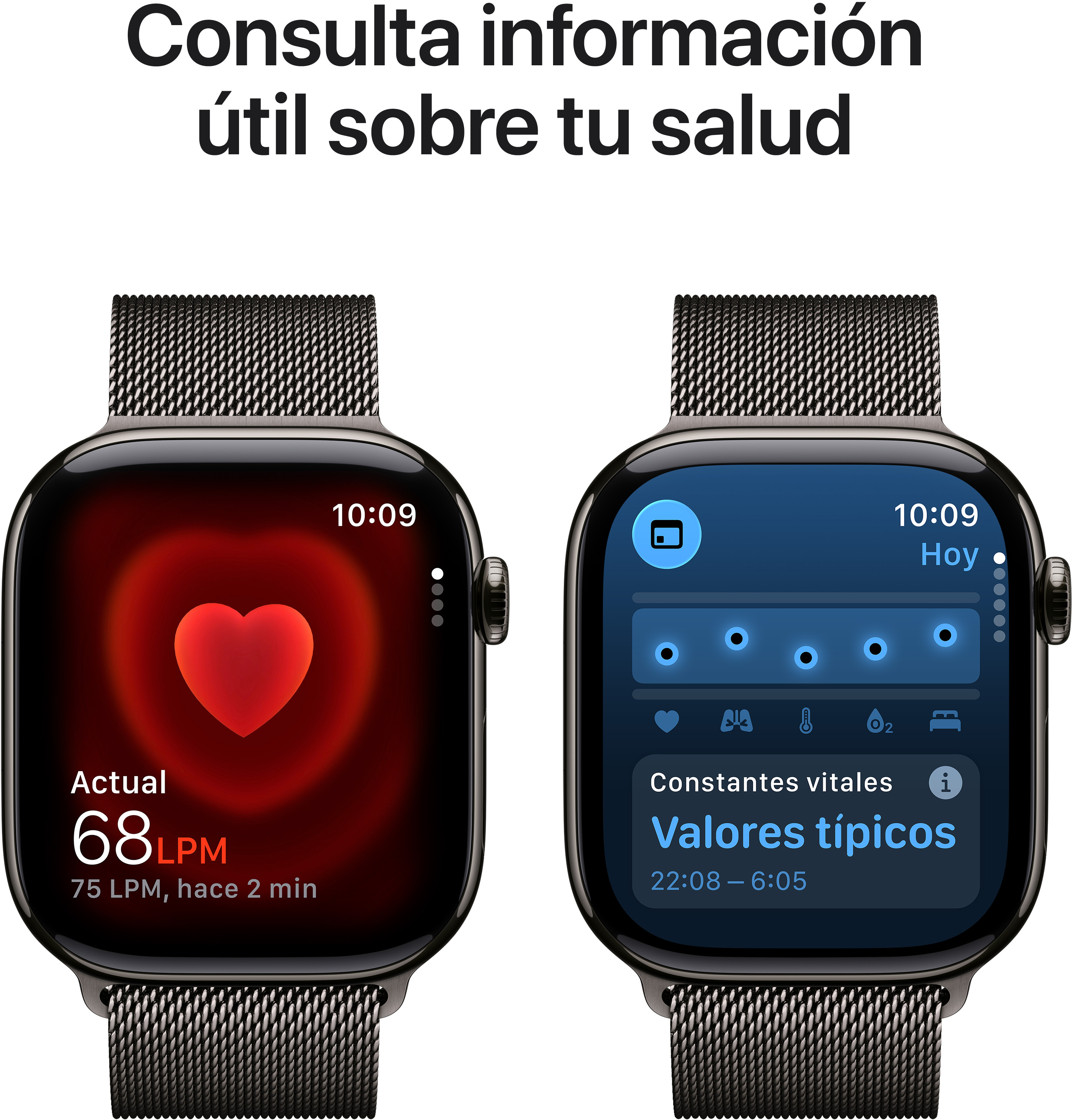 La mejor forma de seguir tu salud.\nConoce tu salud como nadie.\nEl Apple Watch Series 11 ofrece datos de salud detallados, como las notificaciones de frecuencia cardiaca alta o baja y calidad de sueño. Lleva tus entrenos a otro nivel con métricas avanzadas que te ayudan a superarte día a día. Y disfruta de hasta 24 horas de autonomía.\n\nPrestaciones destacadas\n- CONOCE LA CALIDAD DE TU SUEÑO — Calidad del Sueño te ayuda a entender mejor cómo has descansado y qué necesita tu cuerpo para que tus noches sean reparadoras.\n- AÚN MÁS DATOS DE SALUD — Recibe notificaciones de frecuencia cardiaca alta o baja, consulta tu datos de salud nocturnos con la app Constantes Vitales y mídete la saturación de oxígeno en sangre.\n- DISEÑO ESPECTACULAR — El Series 11 es tan fino y ligero que puedes llevarlo cómodamente a todas horas, desde cuando entrenas hasta cuando duermes, y llevar un registro de tus constantes vitales.\n- EL MEJOR COMPAÑERO DE FITNESS — Con métricas avanzadas para registrar todos tus entrenos, como Ritmo Objetivo, Zonas de Frecuencia Cardiaca, carga de ejercicio y mucho más. Además viene con tres meses gratis de Apple Fitness+.\n- UN SUBIDÓN DE AUTONOMÍA — Con hasta 24 horas de uso normal y carga rápida de hasta 8 horas en solo 15 minutos.\n- HECHO PARA DURAR — La pantalla de vidrio es el doble de resistente a los arañazos que la del Series 10. El Series 11 tiene un grado de resistencia al agua de 50 metros y cuenta con certificación IP6X de resistencia al polvo.\n- PRESTACIONES DE SEGURIDAD — El Series 11 detecta si has sufrido una caída brusca o un accidente grave de coche y llama a los servicios de emergencia, además de notificar a los contactos que hayas elegido. Aviso de Llegada informa automáticamente a quien quieras de que ya estás en tu destino.\n- CONECTA CON TU MUNDO — Haz llamadas, envía mensajes, escucha música, usa Siri y recibe notificaciones. El Series 11 (GPS) funciona con tu iPhone o una red wifi para mantenerte en contacto con todo lo que te importa.\n- CONECTA CON TU MUNDO ESTÉS DONDE ESTÉS — Manda mensajes, llama por teléfono, descarga música y podcasts y contacta con los servicios de emergencia sin llevar el iPhone encima. Y gracias a la conexión 5G, ahora puedes disfrutar de la hipervelocidad vayas donde vayas.