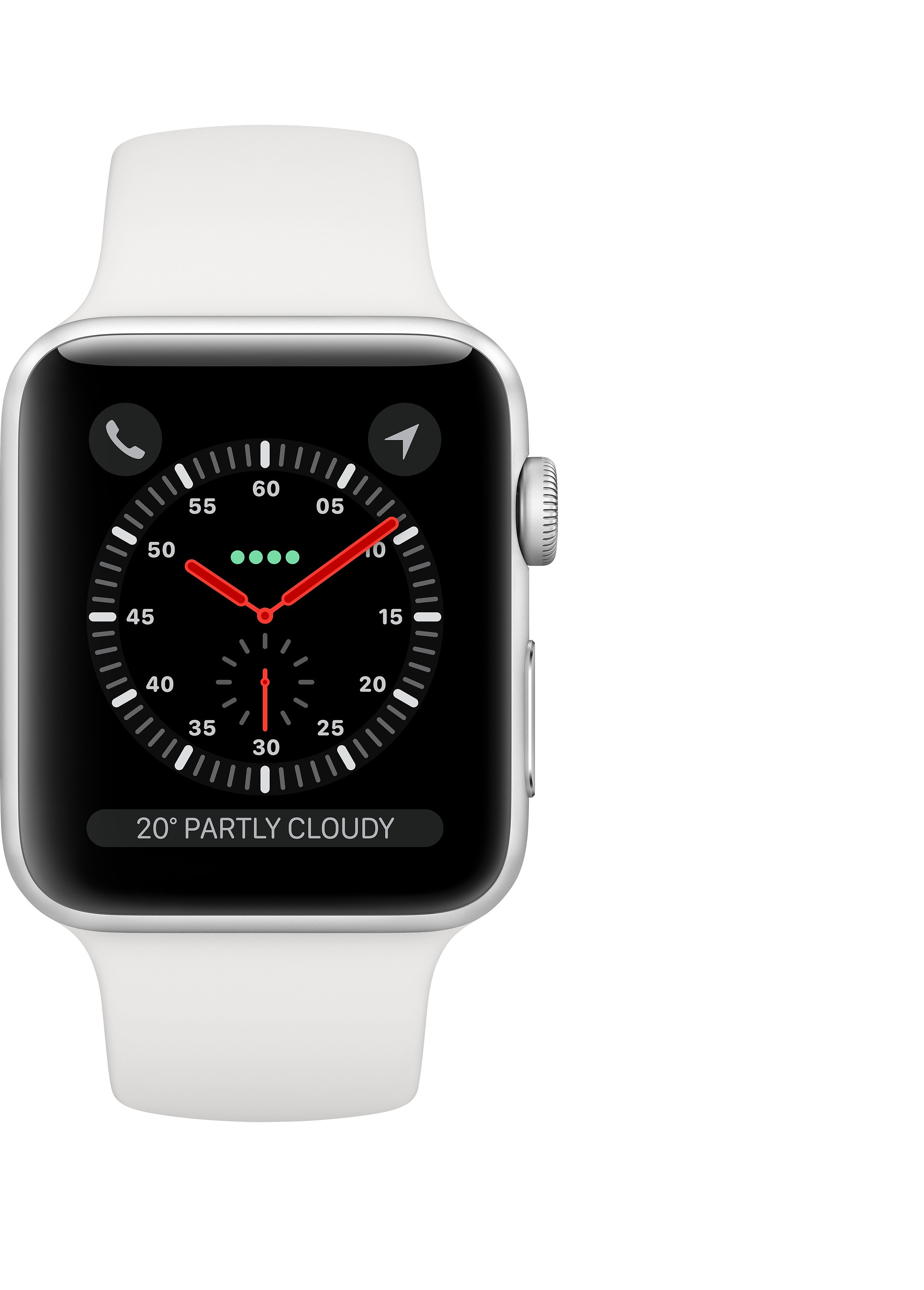 Apple Watch Watch Series 3. Tipo de visualizador: OLED, Resolución de la pantalla: 272 x 340 Pixeles, Pantalla táctil. Memoria flash: 16 GB. Wifi. GPS (satélite), Móvil. Duración de la batería: 18 h. Peso: 28,7 g. Humedad: resistente al agua hasta: 50 m, Material de la carcasa: Aluminio, Color de la carcasa: Plata, Material de la banda: Fluoroelastómero, Color de banda: Blanco. Sistema operativo instalado: watchOS 5