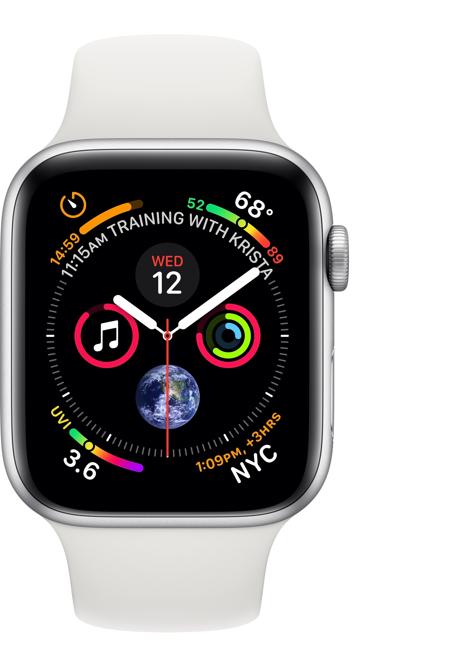 Apple Watch Watch Series 4. Tipo de visualizador: OLED, Resolución de la pantalla: 324 x 394 Pixeles, Pantalla táctil. Memoria flash: 16 GB. Wifi. GPS (satélite). Duración de la batería: 18 h. Peso: 30,1 g. Humedad: resistente al agua hasta: 50 m, Material de la carcasa: Aluminio, Color de la carcasa: Plata, Material de la banda: Fluoroelastómero, Color de banda: Blanco, Tamaño de banda: S/L. Sistema operativo instalado: watchOS 5