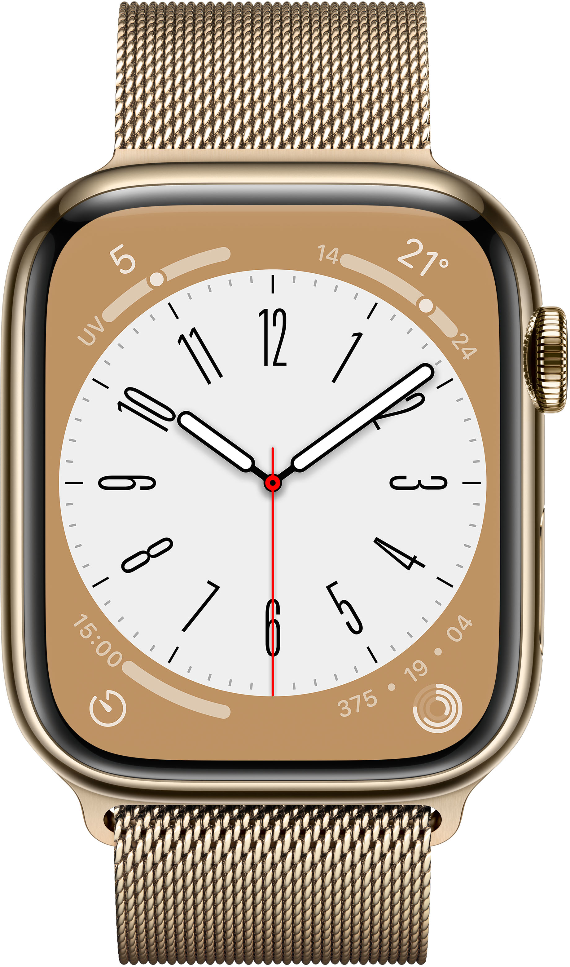 Apple Watch Series 8. Tecnología de visualización: OLED, Resolución de la pantalla: 396 x 484 Pixeles, Pantalla táctil. Memoria flash: 32 GB. Wifi. GPS (satélite). Peso: 51,5 g. Humedad: resistente al agua hasta: 50 m, Color de banda: Oro. Sistema operativo instalado: watchOS 9