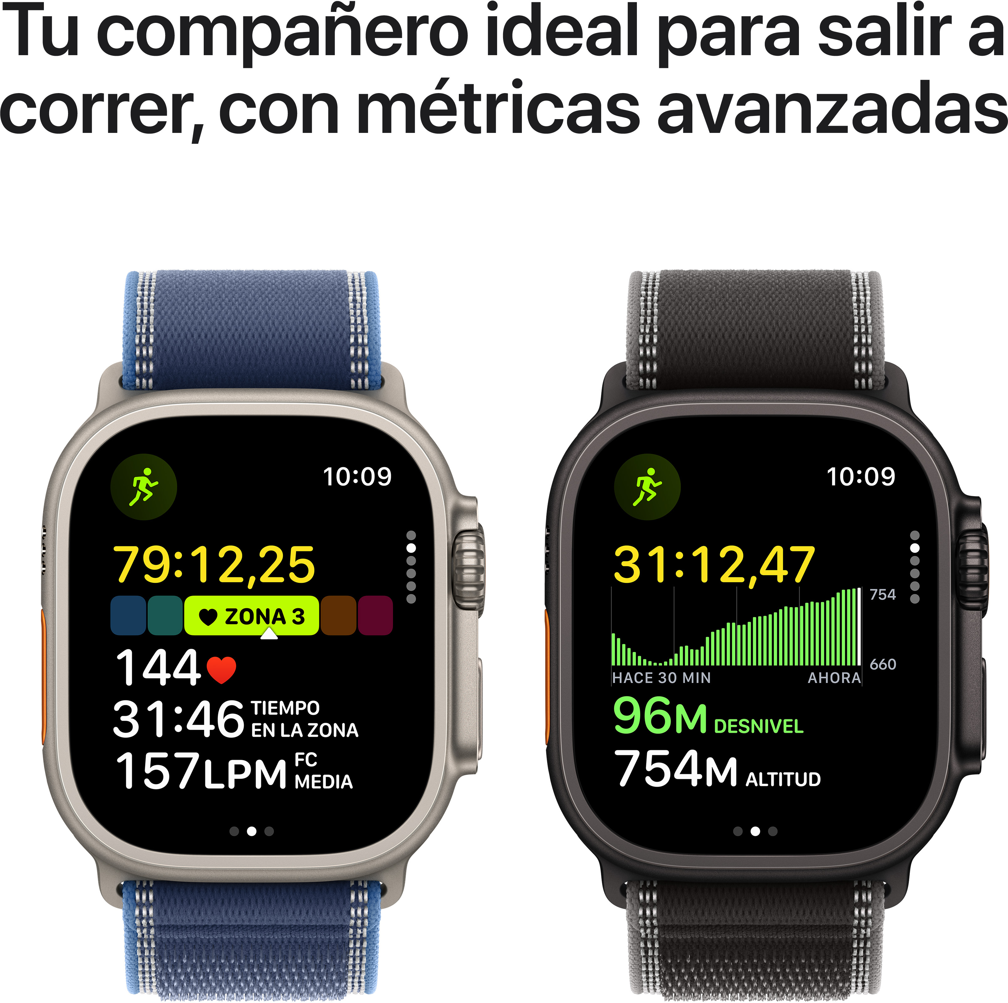 Una fuerza de la naturaleza.\nEl reloj de deporte y aventura definitivo.\nDescubre el reloj de deporte y aventura definitivo.\nEl Apple Watch Ultra 3 ahora incluye comunicaciones vía satélite, autonomía para varios días y la pantalla más grande y brillante en un Apple Watch.3 Por si eso fuera poco, también ofrece métricas avanzadas, Entrenos Personalizados, GPS de doble frecuencia y datos de salud detallados, como las notificaciones de frecuencia cardiaca alta o baja y calidad de sueño. Por algo se llama Ultra.\n\nPrestaciones destacadas\n- UN TODOTERRENO LISTO PARA LA ACCIÓN — El reloj de deporte y aventuras definitivo está hecho para durar, con una caja de titanio ultrarresistente y una pantalla de cristal de zafiro. Tiene grado de resistencia al agua de 100 metros, por lo que puede usarse para nadar, bucear y practicar deportes acuáticos a alta velocidad.\n- PANTALLA ULTRABRILLANTE — La pantalla es más grande y avanzada, con iluminación ampliada para que la veas desde todos los ángulos. Da tanta luz que puedes usarla como linterna.\n- AUTONOMÍA PARA VARIOS DÍAS — Hasta 42 horas de uso normal y hasta 72 horas en modo de bajo consumo. Eso significa que puedes registrar un entreno con el GPS y la medición de frecuencia cardiaca a tope durante 20 horas en modo bajo consumo.\n- TU COMPAÑERO IDEAL PARA SALIR A CORRER y ENTRENAR — GPS de doble frecuencia y alta precisión, Ritmo Objetivo, Zonas de Frecuencia Cardiaca, Entrenos Personalizados, potencia en carrera y carga de ejercicio. Si lo tuyo es el running, la natación o la bici, tienes todo lo que necesitas para cumplir tus objetivos.\n- PRESTACIONES DE SEGURIDAD — El Ultra 3 detecta si has sufrido una caída severa o un accidente grave. Si estás fuera de cobertura o sin wifi, con las comunicaciones vía satélite integradas puedes comunicarte por mensaje con los servicios de emergencia para pedir ayuda.\n- BOTÓN ACCIÓN PERSONALIZABLE — Púlsalo para tener acceso inmediato y preciso a un montón de funciones personalizables, como empezar un entreno o encender la linterna.\n- DATOS DE SALUD DETALLADOS — Recibe notificaciones de frecuencia cardiaca inusualmente alta o baja. Controla la calidad de tu descanso y consulta tu estado de salud diario en la app Constantes Vitales6 y mídete la saturación de oxígeno en sangre.\n- LA LIBERTAD TE LLAMA — Comunícate por teléfono y escucha música y podcasts con los AirPods o a través del altavoz del reloj, todo sin llevar el iPhone encima. Y gracias a la conexión 5G, ahora puedes disfrutar de la hipervelocidad en tus conexiones vayas donde vayas.\n- CORREAS INNOVADORAS — El Ultra 3 tiene cuatro tipos de correa que combinan diseño y versatilidad, pensados para acompañarte en todo lo que haces, desde sudar la camiseta en el gym hasta salir de fiesta.\n