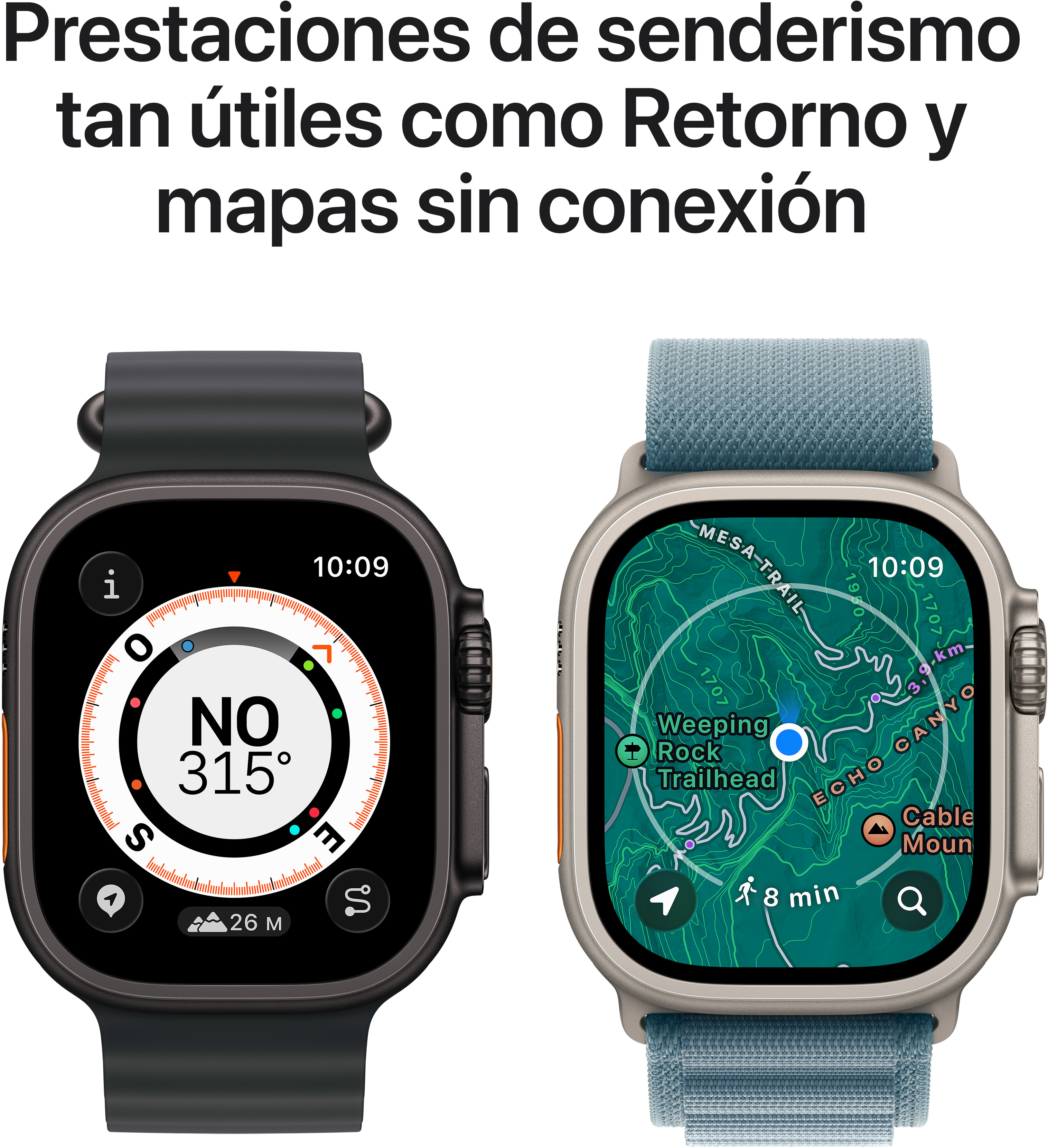 Una fuerza de la naturaleza.\nEl reloj de deporte y aventura definitivo.\nDescubre el reloj de deporte y aventura definitivo.\nEl Apple Watch Ultra 3 ahora incluye comunicaciones vía satélite, autonomía para varios días y la pantalla más grande y brillante en un Apple Watch.3 Por si eso fuera poco, también ofrece métricas avanzadas, Entrenos Personalizados, GPS de doble frecuencia y datos de salud detallados, como las notificaciones de frecuencia cardiaca alta o baja y calidad de sueño. Por algo se llama Ultra.\n\nPrestaciones destacadas\n- UN TODOTERRENO LISTO PARA LA ACCIÓN — El reloj de deporte y aventuras definitivo está hecho para durar, con una caja de titanio ultrarresistente y una pantalla de cristal de zafiro. Tiene grado de resistencia al agua de 100 metros, por lo que puede usarse para nadar, bucear y practicar deportes acuáticos a alta velocidad.\n- PANTALLA ULTRABRILLANTE — La pantalla es más grande y avanzada, con iluminación ampliada para que la veas desde todos los ángulos. Da tanta luz que puedes usarla como linterna.\n- AUTONOMÍA PARA VARIOS DÍAS — Hasta 42 horas de uso normal y hasta 72 horas en modo de bajo consumo. Eso significa que puedes registrar un entreno con el GPS y la medición de frecuencia cardiaca a tope durante 20 horas en modo bajo consumo.\n- TU COMPAÑERO IDEAL PARA SALIR A CORRER y ENTRENAR — GPS de doble frecuencia y alta precisión, Ritmo Objetivo, Zonas de Frecuencia Cardiaca, Entrenos Personalizados, potencia en carrera y carga de ejercicio. Si lo tuyo es el running, la natación o la bici, tienes todo lo que necesitas para cumplir tus objetivos.\n- PRESTACIONES DE SEGURIDAD — El Ultra 3 detecta si has sufrido una caída severa o un accidente grave. Si estás fuera de cobertura o sin wifi, con las comunicaciones vía satélite integradas puedes comunicarte por mensaje con los servicios de emergencia para pedir ayuda.\n- BOTÓN ACCIÓN PERSONALIZABLE — Púlsalo para tener acceso inmediato y preciso a un montón de funciones personalizables, como empezar un entreno o encender la linterna.\n- DATOS DE SALUD DETALLADOS — Recibe notificaciones de frecuencia cardiaca inusualmente alta o baja. Controla la calidad de tu descanso y consulta tu estado de salud diario en la app Constantes Vitales6 y mídete la saturación de oxígeno en sangre.\n- LA LIBERTAD TE LLAMA — Comunícate por teléfono y escucha música y podcasts con los AirPods o a través del altavoz del reloj, todo sin llevar el iPhone encima. Y gracias a la conexión 5G, ahora puedes disfrutar de la hipervelocidad en tus conexiones vayas donde vayas.\n- CORREAS INNOVADORAS — El Ultra 3 tiene cuatro tipos de correa que combinan diseño y versatilidad, pensados para acompañarte en todo lo que haces, desde sudar la camiseta en el gym hasta salir de fiesta.\n