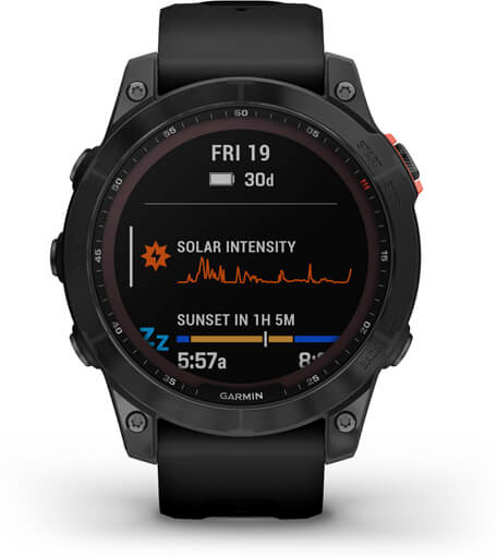 Garmin fenix 7 Solar. Diagonal de la pantalla: 3,3 cm (1.3""), Tipo de visualizador: MIP, Resolución de la pantalla: 260 x 260 Pixeles, Pantalla táctil. Memoria flash: 16 GB. Wifi. GPS (satélite). Peso: 79 g. Material de la banda: Silicona, Color de banda: Negro