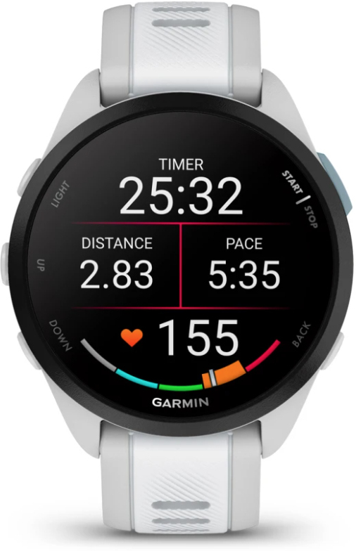 Garmin Forerunner 165. Diagonal de la pantalla: 3,05 cm (1.2""), Tecnología de visualización: AMOLED, Resolución de la pantalla: 390 x 390 Pixeles, Pantalla táctil. Memoria flash: 4 GB. GPS (satélite). Peso: 39 g. Material de la banda: Silicona, Color de banda: Blanco