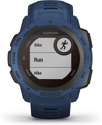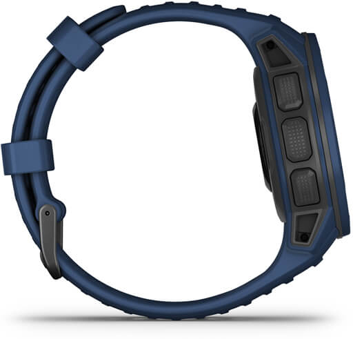 Garmin Instinct Solar. Tipo de visualizador: MIP, Resolución de la pantalla: 128 x 128 Pixeles. Capacidad de RAM: 16 MB. GPS (satélite). Peso: 53 g. Material de la banda: Silicona, Color de banda: Azul