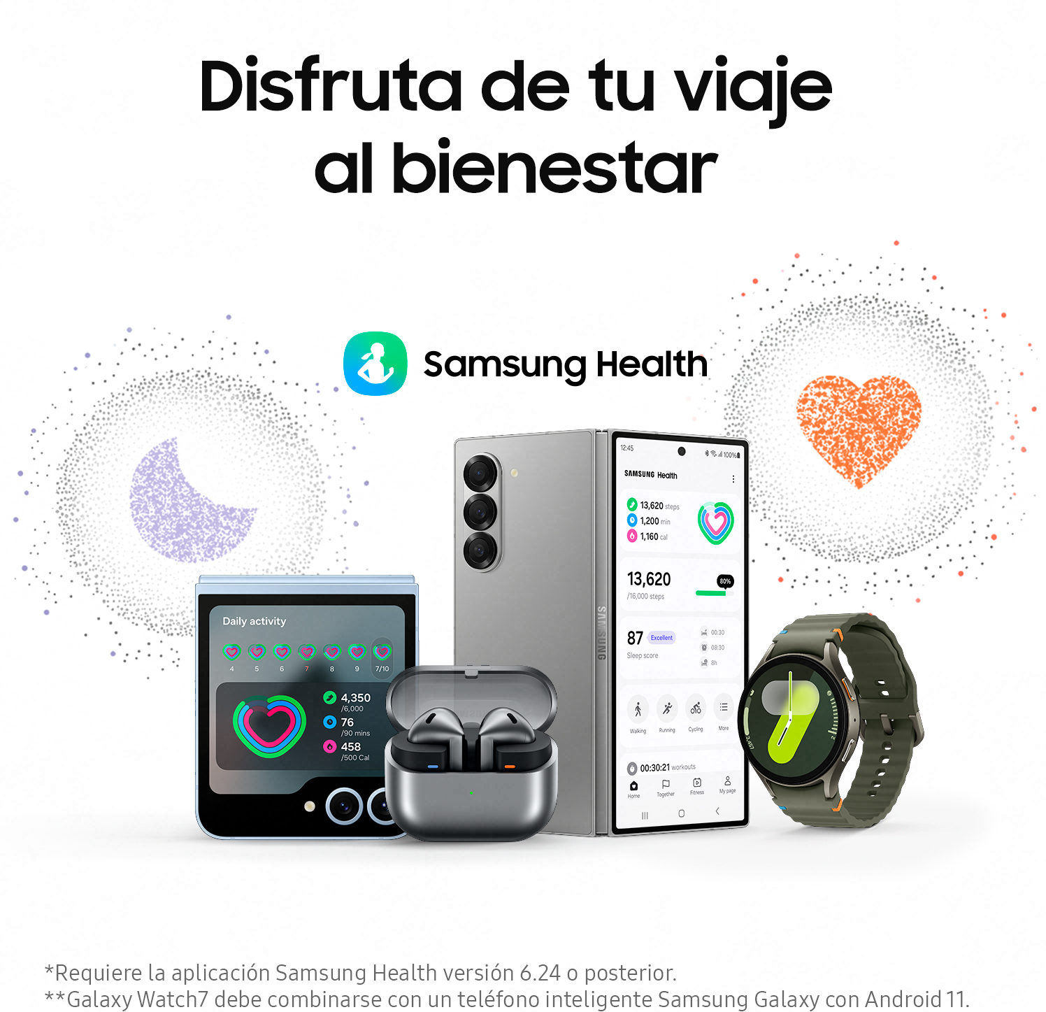 Galaxy Watch7 lleva tu salud y fitness a otro nivel. El Sensor BioActive con 13 LED monitorea con precisión tus signos vitales y patrones de sueño, evaluando tu energía diaria con Energy Score. Además, es el primer smartwatch con detección de apnea del sueño aprobada por la FDA. Registra tus entrenamientos con precisión, incluso bajo el agua, mientras Galaxy AI ajusta dinámicamente la monitorización de la frecuencia cardíaca según la actividad, optimizando tu rendimiento en carreras y ciclismo con métricas personalizadas.