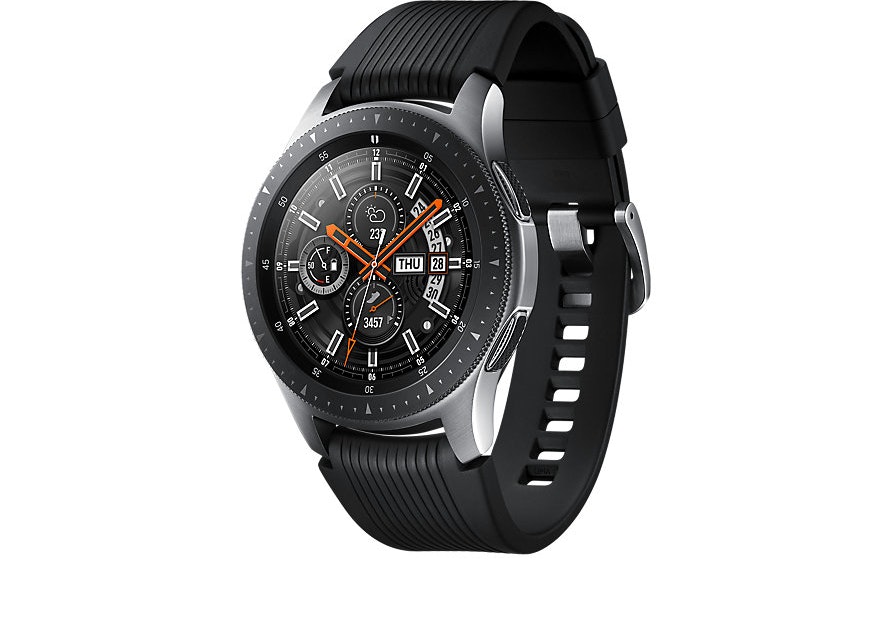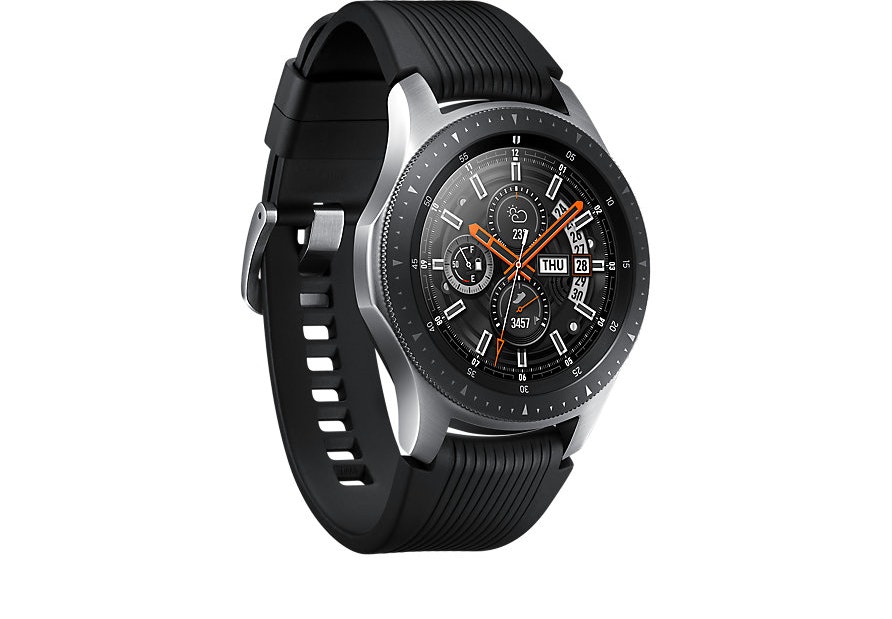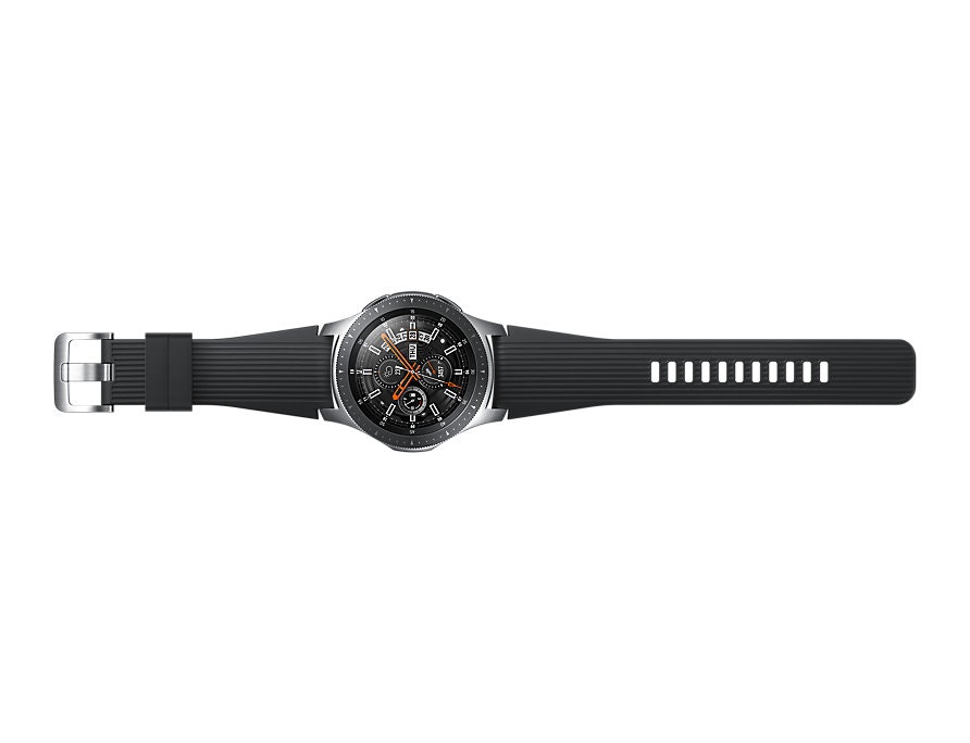 Samsung Galaxy Watch. Diagonal de la pantalla: 3,3 cm (1.3""), Tipo de visualizador: SAMOLED, Resolución de la pantalla: 360 x 360 Pixeles, Pantalla táctil, Frecuencia del procesador: 1150 MHz. Capacidad de RAM: 750 MB, Memoria flash: 4 GB. Wifi. GPS (satélite). Duración de la batería: 168 h, Capacidad de batería: 472 mAh. Peso: 63 g. Material de la carcasa: Acero inoxidable, Color de la carcasa: Plata, Color de banda: Negro