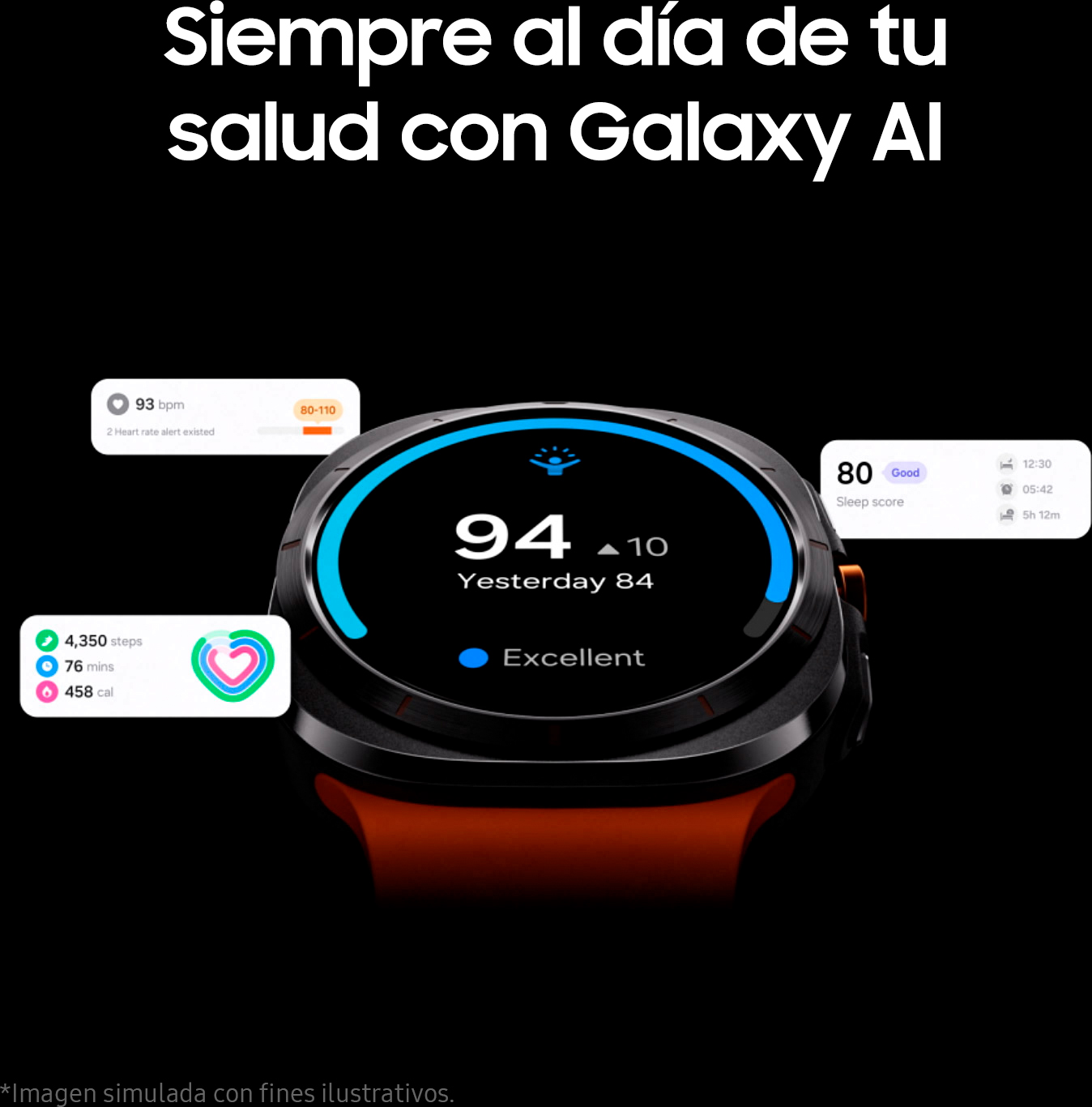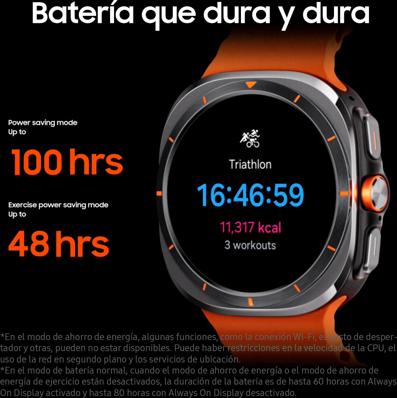 Disfruta de un rendimiento optimizado con funciones como GPS de doble frecuencia, que te garantiza una navegación precisa, y una batería de larga duración que te ofrece hasta 100 horas en modo ahorro de energía. Monitorea tu salud con precisión con el sensor BioActive, que supervisa tus signos vitales y patrones de sueño, proporcionando análisis detallados y consejos personalizados a través de Galaxy AI. Desde la medición de la presión arterial hasta la evaluación del sueño, Galaxy Watch Ultra te acompaña a cada paso del camino.