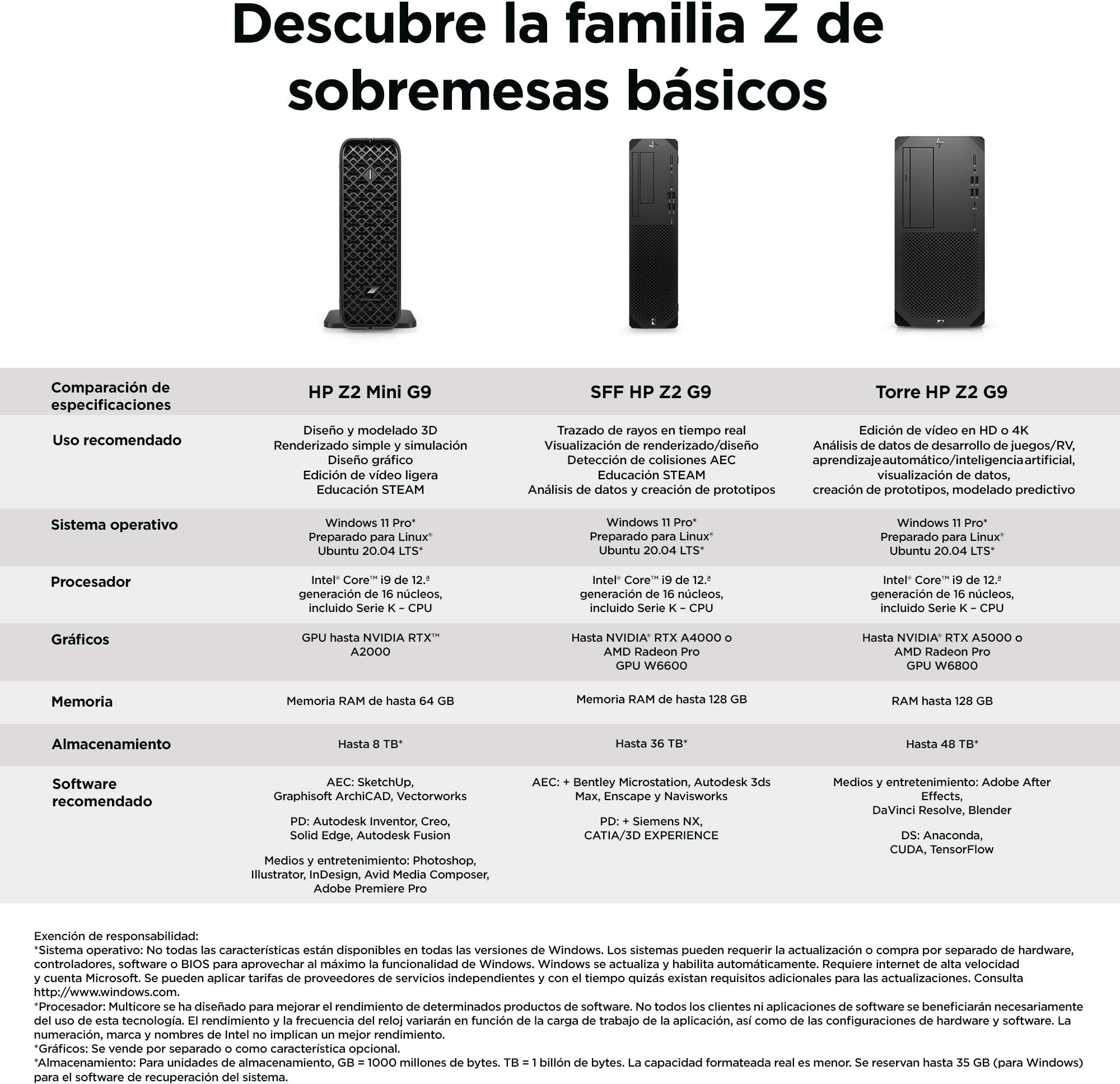 HP Z2 G9. Frecuencia del procesador: 3,6 GHz, Familia de procesador: Intel® Core™ i7, Modelo del procesador: i7-12700K. Memoria interna: 16 GB, Tipo de memoria interna: DDR5-SDRAM, Velocidad de memoria del reloj: 4800 MHz. Capacidad total de almacenaje: 512 GB, Unidad de almacenamiento: SSD. Modelo de adaptador gráfico incorporado: Intel UHD Graphics 770, Modelo de adaptador de gráficos discretos: NVIDIA Quadro T1000. Sistema operativo instalado: Windows 11 Pro. Fuente de alimentación: 450 W. Tipo de chasis: Torre. Tipo de producto: Puesto de trabajo. Color del producto: Negro