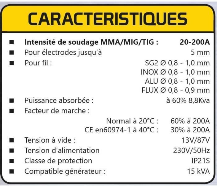 Con una potencia de soldadura de 20 a 200A, la VIP MULTI 200 es la máquina de uso general ideal para trabajos de soldadura y sitios de acero, hierro fundido y acero inoxidable. Se entrega con una pinza portaelectrodos, una pinza de tierra, una antorcha MIG, una máscara de soldadura CE y un cepillo de martillo. Configuración profesional: 2 modos de soldadura 2T / 4T y función VRD (Dispositivo de reducción de voltaje). Doble pantalla digital, velocidad de hilo e intensidad lineal regulable. Bobina compatible Diam. 100 y 200 mm (5 kg). Linterna Mig desconectable. Compatible con todo tipo de electrodos hasta 5 mm y todo tipo de alambre macizo o tubular hasta 1,2 mm. Se suministra con pinza de tierra, antorcha MIG, cepillo de martillo y máscara de soldadura manual CE.