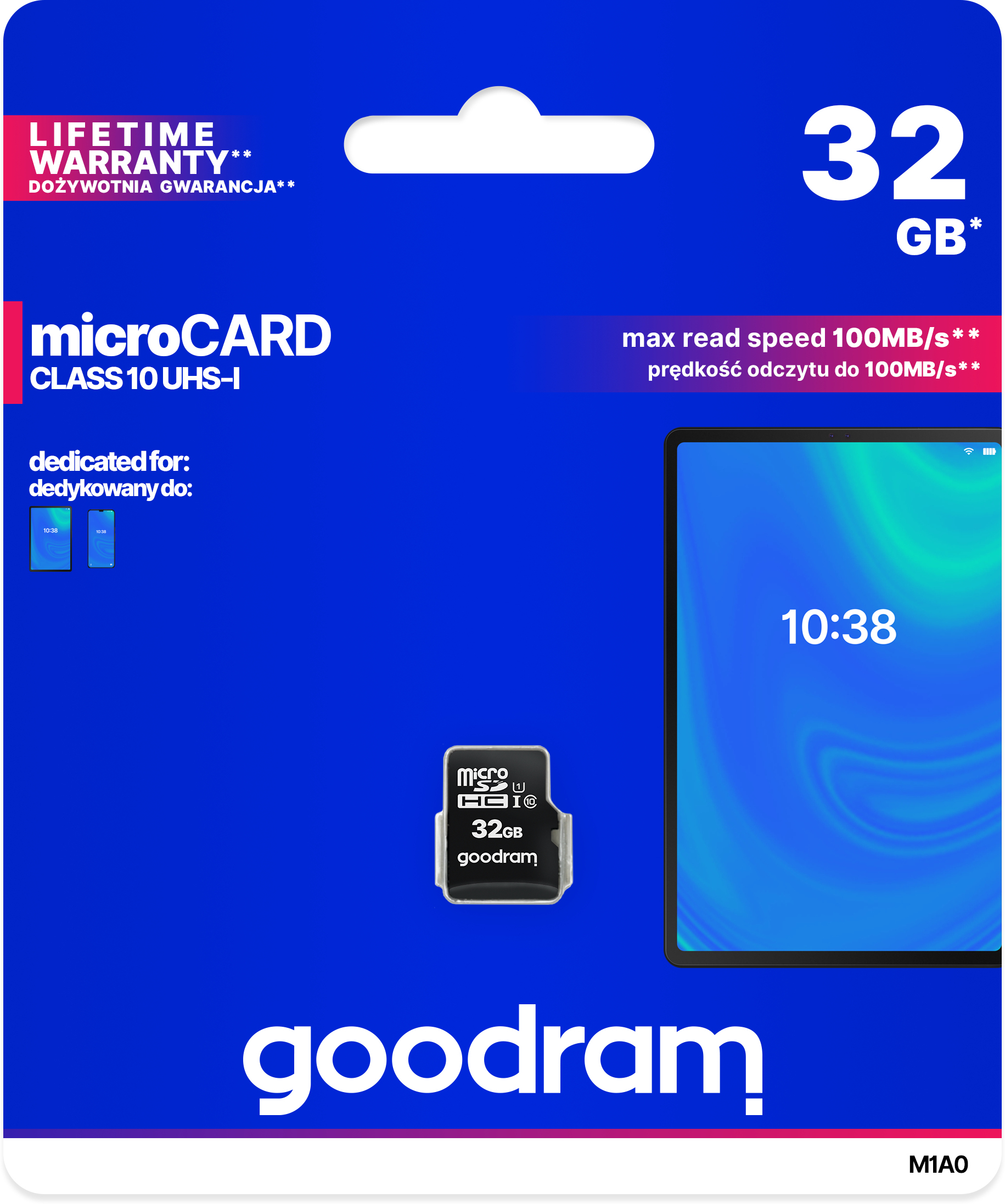 Goodram M1A0. Capacidad: 32 GB, Tipo de tarjeta flash: MicroSDHC, Clase de memoria flash: Clase 10, Tipo de memoria interna: UHS-I, Velocidad de lectura: 100 MB/s, Velocidad de escritura: 10 MB/s, Clase de velocidad UHS: Class 1 (U1). Funciones de protección: Protección contra campos magnéticos, Resistente a golpes, Resistente al agua, A prueba de rayos X, Color del producto: Negro