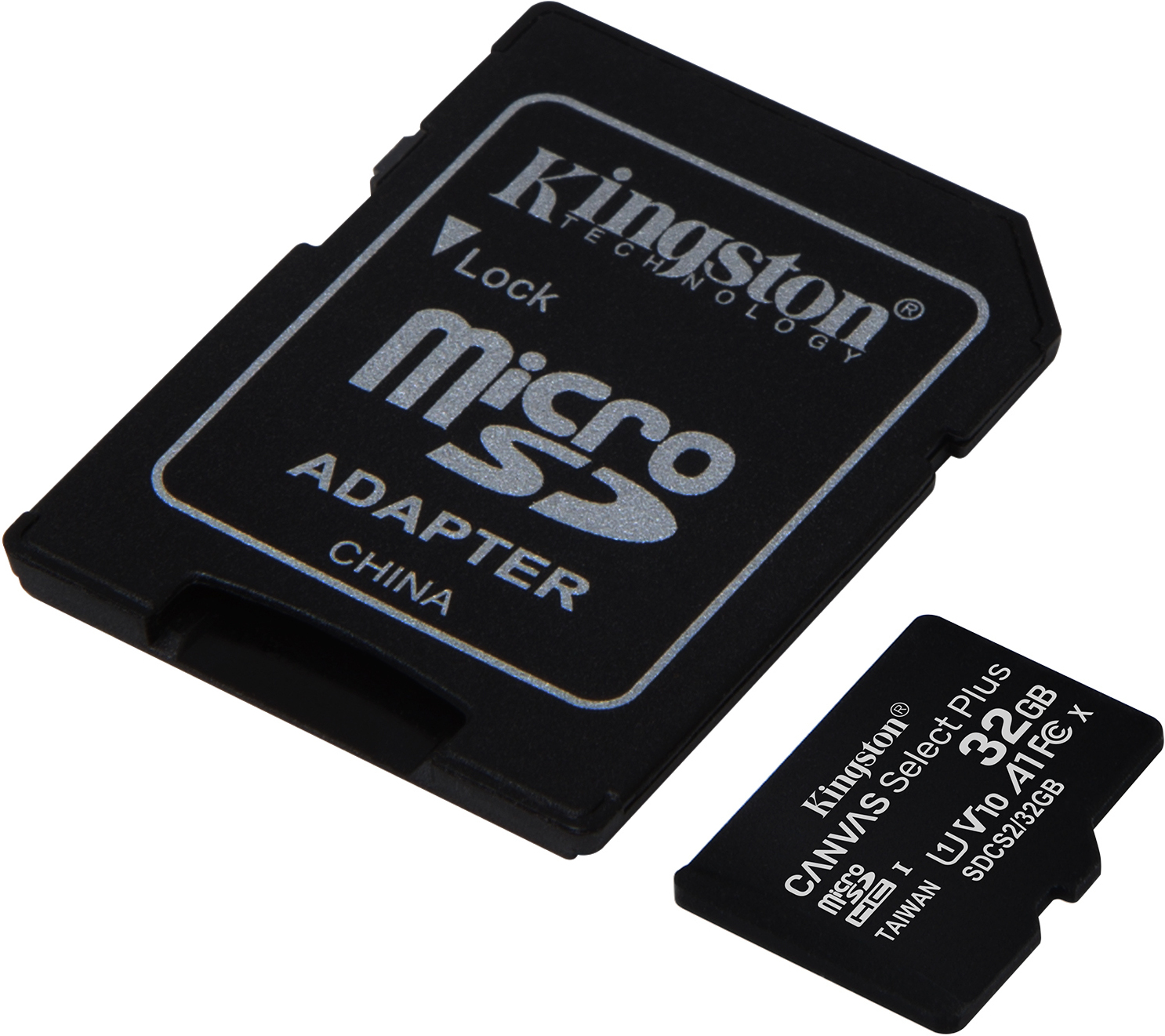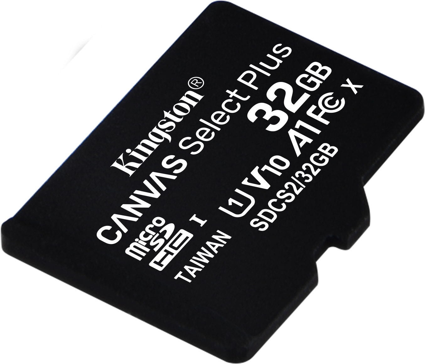 Kingston Technology Canvas Select Plus. Capacidad: 32 GB, Tipo de tarjeta flash: MicroSDHC, Clase de memoria flash: Clase 10, Tipo de memoria interna: UHS-I, Velocidad de lectura: 100 MB/s, Clase de velocidad UHS: Class 1 (U1), Clase de velocidad de vídeo: V10. Funciones de protección: Resistente a golpes, Resistente a las vibraciones, A prueba de rayos X, Color del producto: Negro